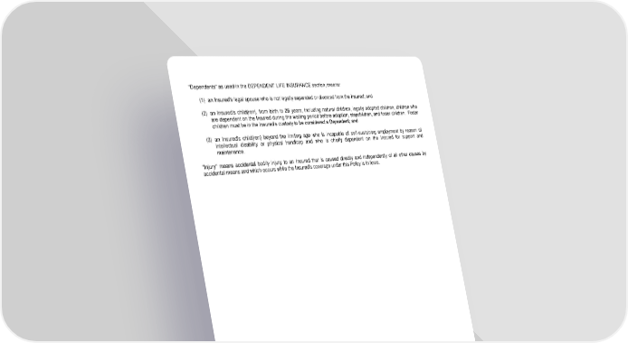 "Dependents" as used in the DEPENDENT LIFE INSURANCE section, means: (1) an Insured's legal spouse who is not legally separated or divorced from the Insured; and (2) an Insured's child(ren), from birth to 26 years, including natural children, legally adopted children, children who are dependent on the Insured during the waiting period before adoption, stepchildren, and foster children. Foster children must be in the Insured’s custody to be considered a Dependent; and (3) an Insured's child(ren) beyond the limiting age who is incapable of self-sustaining employment by reason of intellectual disability or physical handicap and who is chiefly dependent on the Insured for support and maintenance. "Injury" means accidental bodily injury to an Insured that is caused directly and independently of all other causes by accidental means and which occurs while the Insured's coverage under this Policy is in force. LRS-6422-3 Ed. 06/01 Page 2.1