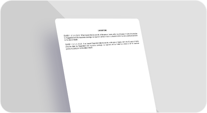 LIMITATIONS CLASS 1, 2, 3, 4, 5 & 6: If the Insured dies by suicide, while sane or insane, within two (2) years of his/her effective date for Supplemental Life insurance coverage, our payment will be limited to a refund of all life insurance premiums paid prior to the date of death. CLASS 1, 2, 3, 4, 5 & 6: If an insured Dependent dies by suicide, while sane or insane, within two (2) years of his/her effective date for Dependent Life insurance coverage, our payment will be limited to a refund of all life insurance premiums paid prior to the date of death. LRS-6422-844 Ed. 04/16 Page 4.0