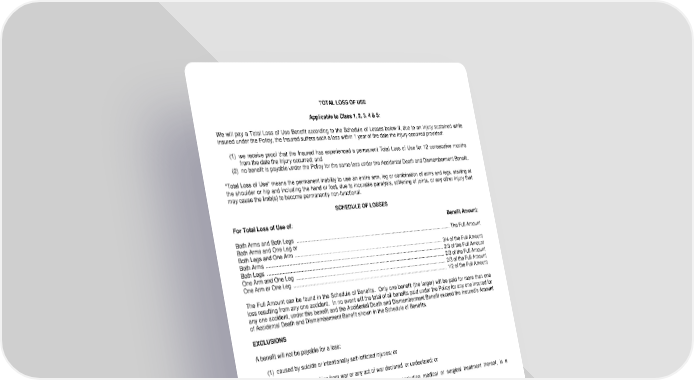 TOTAL LOSS OF USE Applicable to Class 1, 2, 3, 4 & 5: We will pay a Total Loss of Use Benefit according to the Schedule of Losses below if, due to an Injury sustained while insured under the Policy, the Insured suffers such a loss within 1 year of the date the Injury occurred provided: (1) we receive proof that the Insured has experienced a permanent Total Loss of Use for 12 consecutive months from the date the Injury occurred; and (2) no benefit is payable under the Policy for the same loss under the Accidental Death and Dismemberment Benefit. "Total Loss of Use" means the permanent inability to use an entire arm, leg or combination of arms and legs, starting at the shoulder or hip and including the hand or foot, due to incurable paralysis, stiffening of joints, or any other Injury that may cause the limb(s) to become permanently non-functional. SCHEDULE OF LOSSES For Total Loss of Use of: Benefit Amount: Both Arms and Both Legs ........................................................................................................................... The Full Amount Both Arms and One Leg or Both Legs and One Arm ..................................................................................................................... 3/4 of the Full Amount Both Arms ........................................................................................................................................... 2/3 of the Full Amount Both Legs ........................................................................................................................................... 2/3 of the Full Amount One Arm and One Leg ....................................................................................................................... 2/3 of the Full Amount One Arm or One Leg .......................................................................................................................... 1/2 of the Full Amount The Full Amount can be found in the Schedule of Benefits. Only one benefit (the larger) will be paid for more than one loss resulting from any one accident. In no event will the total of all benefits paid under the Policy for any one Insured for any one accident, under this benefit and the Accidental Death and Dismemberment Benefit exceed the Insured’s Amount of Accidental Death and Dismemberment Benefit shown in the Schedule of Benefits. EXCLUSIONS A benefit will not be payable for a loss: (1) caused by suicide or intentionally self-inflicted injuries; or (2) caused by or resulting from war or any act of war declared or undeclared; or (3) to which sickness, disease or myocardial infarction, including medical or surgical treatment thereof, is a contributing factor; or (4) sustained during the Insured’s commission or attempted commission of an assault or felony; or (5) to which the Insured’s acute or chronic alcoholic intoxication is a contributing factor; or (6) to which the Insured’s voluntary consumption of an illegal or controlled substance or a non-prescribed narcotic or drug is a contributing factor. LRS-6422-169 Ed. 06/01 Page 12.0