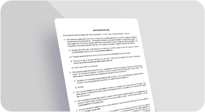 CONVERSION PRIVILEGE An Insured can use this privilege when his/her insurance is no longer in force. It has several parts. They are: A. If the insurance ceases due to termination of employment or membership in any of this Policy's classes, an individual Life Insurance Policy may be issued. The Insured is entitled to a policy without disability or supplemental benefits. A written application for the policy must be made by the Insured within thirty-one (31) days after he/she terminates. The first premium must also be paid within that time. The issuance of the policy is subject to the following conditions: (1) The policy will, at the option of the Insured, be on any one of our forms, except for term life insurance. It will be the standard type issued by us for the age and amount applied for; (2) The policy issued will be for an amount not over what the Insured had before he/she terminated; (3) The premium due for the policy will be at our usual rate. This rate will be based on the amount of insurance, class of risk and the Insured's age at date of policy issue; and (4) Proof of good health is not required. B. If the insurance ceases due to the termination or amendment of this Policy, an individual Life Insurance Policy can be issued. An Insured must have been insured for at least five (5) years under this Policy and/or the prior carrier. The same rules as in A above will be used, except that the face amount will be the lesser of: (1) The amount of the Insured's Group Life benefit under this Policy. This amount will be less any amount he/she is entitled to under any group life policy issued by us or another insurance company; or (2) $10,000. C. If the insurance reduces, as may be provided in this Policy, an individual Life Insurance Policy can be issued. The same rules as in A above will be used, except that the face amount will not be greater than the amount which ceased due to the reduction. D. If an Insured dies during the time provided in A above in which he/she is entitled to apply for an individual policy, we will pay the benefit under the Group Policy that he/she was entitled to convert. This will be done whether or not the Insured applied for the individual policy. E. Any policy issued with respect to A, B or C above will be put in force at the end of the thirty-one (31) day period in which application must be made. F. If an Insured is entitled to have an individual policy issued to him/her without proof of health, then he/she must be given notice of this right at least fifteen (15) days before the end of the period specified to make written application for conversion shown above. Such notice must be: (1) in writing; and (2) presented or mailed to the Insured by you. If not, the Insured will have an additional period in order to do so. This additional period will end fifteen (15) days after the Insured is given notice but will not extend beyond sixty (60) days after the expiration date of the application period provided in A above. LRS-6422-30 Ed. 9/83 Page 6.0