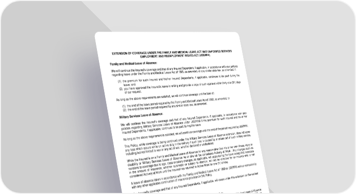 EXTENSION OF COVERAGE UNDER THE FAMILY AND MEDICAL LEAVE ACT AND UNIFORMED SERVICES EMPLOYMENT AND REEMPLOYMENT RIGHTS ACT (USERRA) Family and Medical Leave of Absence: We will continue the Insured's coverage and that of any Insured Dependent, if applicable, in accordance with your policies regarding leave under the Family and Medical Leave Act of 1993, as amended, or any similar state law, as amended, if: (1) the premium for such Insured and his/her Insured Dependents, if applicable, continues to be paid during the leave; and (2) you have approved the Insured's leave in writing and provide a copy of such approval within thirty-one (31) days of our request. As long as the above requirements are satisfied, we will continue coverage until the later of: (1) the end of the leave period required by the Family and Medical Leave Act of 1993, as amended; or (2) the end of the leave period required by any similar state law, as amended. Military Services Leave of Absence: We will continue the Insured’s coverage and that of any Insured Dependents, if applicable, in accordance with your policies regarding Military Services Leave of Absence under USERRA if the premium for such Insured and his or her Insured Dependents, if applicable, continues to be paid during the leave. As long as the above requirement is satisfied, we will continue coverage until the end of the period required by USERRA. This Policy, while coverage is being continued under this Military Services Leave of Absence extension, does not cover any loss which occurs while on active duty in the military if such loss is caused by or arises out of such military service, including but not limited to war or any act of war, whether declared or undeclared. While the Insured is on a Family and Medical Leave of Absence for any reason other than his or her own illness, injury or disability or Military Services Leave of Absence he or she will be considered Actively at Work. Any changes such as revisions to coverage due to age, class or salary changes, as applicable, will apply during the leave except that increases in the amount of insurance, whether automatic or subject to election, will not be effective for an Insured who is not considered Actively at Work until the Insured has returned to Active Work for one (1) full day. A leave of absence taken in accordance with the Family and Medical Leave Act of 1993 or USERRA will run concurrently with any other applicable continuation of insurance provision in this Policy. The Insured's coverage and that of any Insured Dependents, if applicable, will cease under this extension on the earliest of: (1) the date this Policy terminates; or (2) the end of the period for which premium has been paid for the Insured; or (3) the date such leave should end in accordance with your policies regarding Family and Medical Leave of Absence and Military Services Leave of Absence in compliance with the Family and Medical Leave Act of 1993, as amended and USERRA. Should you choose not to continue the Insured's coverage during a Family and Medical Leave of Absence and/or Military Services Leave of Absence, the Insured's coverage as well as any dependent coverage, if applicable, will be reinstated. LRS-6422-678 Ed. 06/08 Page 16.0