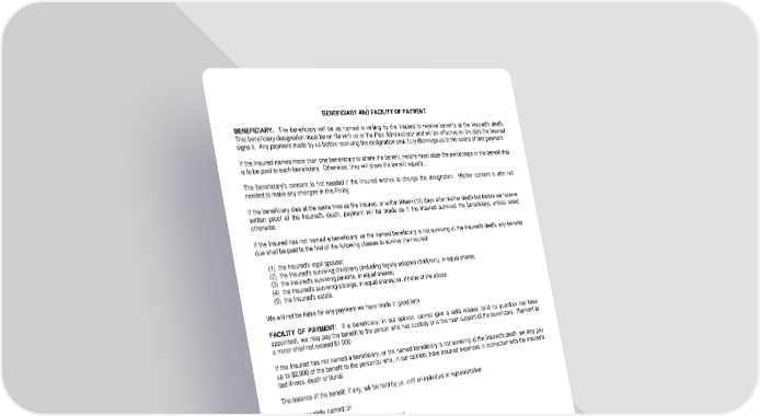 BENEFICIARY AND FACILITY OF PAYMENT BENEFICIARY: The beneficiary will be as named in writing by the Insured to receive benefits at the Insured's death. This beneficiary designation must be on file with us or the Plan Administrator and will be effective on the date the Insured signs it. Any payment made by us before receiving the designation shall fully discharge us to the extent of that payment. If the Insured names more than one beneficiary to share the benefit, he/she must state the percentage of the benefit that is to be paid to each beneficiary. Otherwise, they will share the benefit equally. The beneficiary's consent is not needed if the Insured wishes to change the designation. His/her consent is also not needed to make any changes in this Policy. If the beneficiary dies at the same time as the Insured, or within fifteen (15) days after his/her death but before we receive written proof of the Insured's death, payment will be made as if the Insured survived the beneficiary, unless noted otherwise. If the Insured has not named a beneficiary, or the named beneficiary is not surviving at the Insured's death, any benefits due shall be paid to the first of the following classes to survive the Insured: (1) the Insured's legal spouse; (2) the Insured's surviving child(ren) (including legally adopted child(ren)), in equal shares; (3) the Insured's surviving parents, in equal shares; (4) the Insured's surviving siblings, in equal shares; or, if none of the above, (5) the Insured's estate. We will not be liable for any payment we have made in good faith. FACILITY OF PAYMENT: If a beneficiary, in our opinion, cannot give a valid release (and no guardian has been appointed), we may pay the benefit to the person who has custody or is the main support of the beneficiary. Payment to a minor shall not exceed $1,000. If the Insured has not named a beneficiary, or the named beneficiary is not surviving at the Insured's death, we may pay up to $2,000 of the benefit to the person(s) who, in our opinion, have incurred expenses in connection with the Insured's last illness, death or burial. The balance of the benefit, if any, will be held by us, until an individual or representative: (1) is validly named; or (2) is appointed to receive the proceeds; and (3) can give valid release to us. The benefit will be held with interest at a rate set by us. We will not be liable for any payment we have made in good faith. LRS-6422-37 Ed. 11/00 Page 8.0
