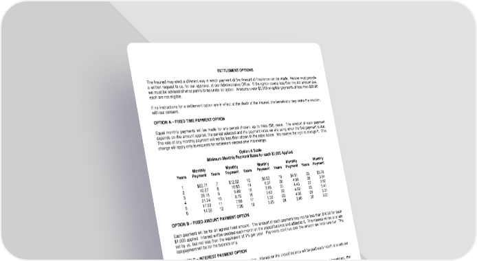 SETTLEMENT OPTIONS The Insured may elect a different way in which payment of the Amount of Insurance can be made. He/she must provide a written request to us, for our approval, at our Administrative Office. If the option covers less than the full amount due, we must be advised of what part is to be under an option. Amounts under $2,000 or option payments of less than $20.00 each are not eligible. If no instructions for a settlement option are in effect at the death of the Insured, the beneficiary may make the election, with our consent. OPTION A – FIXED TIME PAYMENT OPTION Equal monthly payments will be made for any period chosen, up to thirty (30) years. The amount of each payment depends on the amount applied, the period selected and the payment rates we are using when the first payment is due. The rate of any monthly payment will not be less than shown in the table below. We reserve the right to change it. This change will apply only to requests for settlement elected after this change. Option A Table Minimum Monthly Payment Rates for each $1,000 Applied Monthly Monthly Monthly Monthly Monthly Years Payment Years Payment Years Payment Years Payment Years Payment 1 $83.71 7 $12.32 13 $6.83 19 $4.81 25 $3.76 2 42.07 8 10.83 14 6.37 20 4.59 26 3.64 3 28.18 9 9.68 15 5.98 21 4.40 27 3.52 4 21.24 10 8.75 16 5.63 22 4.22 28 3.41 5 17.08 11 7.99 17 5.33 23 4.05 29 3.31 6 14.30 12 7.36 18 5.05 24 3.90 30 3.21 OPTION B – FIXED AMOUNT PAYMENT OPTION Each payment will be for an agreed fixed amount. The amount of each payment may not be less than $10.00 for each $1,000 applied. Interest will be credited each month on the unpaid balance and added to it. This interest will be at a rate set by us, but not less than the equivalent of 1% per year. Payments continue until the amount we hold runs out. The last payment will be for the balance only. OPTION C – INTEREST PAYMENT OPTION We will hold any amount applied under this section. Interest on the unpaid balance will be paid each month at a rate set by us. This rate will not be less than the equivalent of 1% per year. If a beneficiary dies while receiving payments under one of these options and there is no contingent beneficiary, the balance will be paid in one sum to the proper representative of the beneficiary's estate, unless otherwise agreed to in the instructions for settlement. Requests for settlement options other than the three (3) set out above may be made. A mutual agreement must be reached between the individual entitled to elect and us. LRS-6422-10 Ed. 04/16 Page 9.0