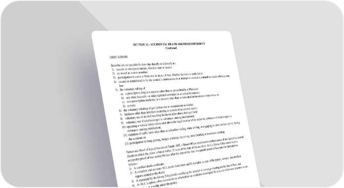 SECTION12-ACCIDENTALDEATHANDDISMEMBERMENT Continued LIMITATIONS Benefits are not payable for loss due directly or indirectly to: 1) suicide or attempted suicide, whether sane or insane; 2) air travel as a crew member; 3) participation in a riot or from war or an act of war, whether declared or undeclared; 4) causedor contributed to by the insured’s commission of or attempt to commit a criminal act under relevant state law; 5) the voluntary taking of: a) a prescription drug in a manner other than as prescribed by a Physician; b) anyother federally- or state-regulated substance in an unlawful manner; c) non-prescription medicine, in a manner other than as indicated in the printed instructions; or d) poison; 6) the voluntary inhaling of gas (unless due to occupational accident); 7) Sickness other than infection occurring as a result of accidental injury; 8) voluntary use of alcohol resulting in intoxication above the legal limit; 9) voluntary use of a hallucinogen or substance causing intoxication; 10) operating a vehicle while intoxicated above the legal limit or while under the influence of hallucinogen or substance causing intoxication; 11) violation of traffic laws other than an infraction, racing, stunt-driving, or engaging in other similar activity during the accident; or 12) participation in hang-gliding, bungee jumping, skydiving, rock climbing or mountain climbing. Notice and Proof of Injury/Accidental Death: AUL’s Home Office must receive written notice of the injury/Accidental Death on which the claim is based within 31 days of the date of the accident. AUL’s Home Office must receive acceptable proof of loss within 90 days after the date of the loss. Acceptable proof of loss must be furnished as follows: 1) Acertified death certificate; 2) AcompleteandaccurateAULdeathclaimformandifavailable,acopyofthepolice,autopsy,andmedical reports related to the death; 3) AstatementbytheGroupPolicyholdercertifying the amount of coverage existing on the date of loss; and 4) AtAUL’soption,otherdocumentsorinformationasneededto investigatethe loss and determine whether or not benefits are payable under the policy. AULhastherighttoexamineYou: 1) asoften as necessary; 2) at AUL’sexpense;and 3) byamedicalprofessionalof AUL’schoice. GC2510.14/3 SECTION12-ACCIDENTALDEATHANDDISMEMBERMENT