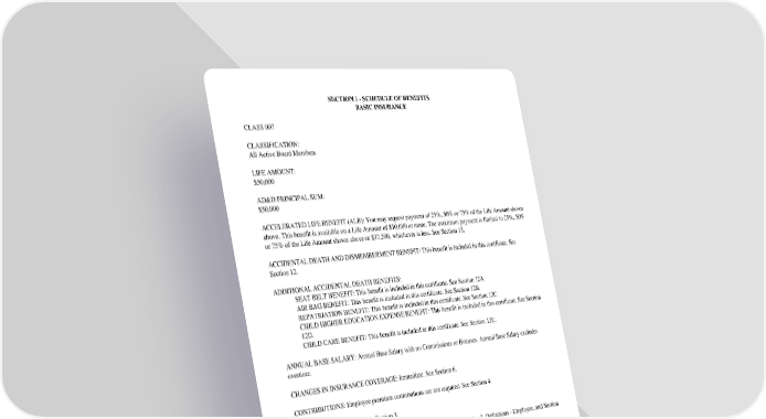 SECTION1-SCHEDULEOFBENEFITS BASICINSURANCE CLASS007 CLASSIFICATION: All Active Board Members LIFEAMOUNT: $50,000 AD&DPRINCIPALSUM: $50,000 ACCELERATEDLIFEBENEFIT(ALB):Youmayrequestpaymentof25%,50%or75%oftheLifeAmountshown above. This benefit is available on a Life Amount of $10,000 or more. The maximum payment is limited to 25%, 50% or 75% of the Life Amount shown above or $37,500, whichever is less. See Section 13. ACCIDENTALDEATHANDDISMEMBERMENTBENEFIT:Thisbenefitisincludedinthiscertificate.See Section 12. ADDITIONALACCIDENTALDEATHBENEFITS: SEATBELTBENEFIT:Thisbenefitisincludedinthiscertificate.SeeSection12A. AIRBAGBENEFIT:Thisbenefitisincludedinthiscertificate.SeeSection12B. REPATRIATIONBENEFIT:Thisbenefitisincludedinthiscertificate.SeeSection12C. CHILDHIGHEREDUCATIONEXPENSEBENEFIT:Thisbenefitisincludedinthiscertificate.SeeSection 12D. CHILDCAREBENEFIT:Thisbenefitisincludedinthiscertificate.SeeSection12E. ANNUALBASESALARY:AnnualBaseSalarywithnoCommissionsorBonuses.AnnualBaseSalaryexcludes overtime. CHANGESININSURANCECOVERAGE:Immediate.SeeSection6. CONTRIBUTIONS:Employeepremiumcontributionsarenotrequired.SeeSection4. ELIGIBILITY:Immediate.SeeSection3. FULL-TIMEEMPLOYEEREQUIREMENT:24hoursannually.SeeSection2,Definitions-Employee,andSection 3, Eligibility. GC2510.2 SECTION1-SCHEDULEOFBENEFITS