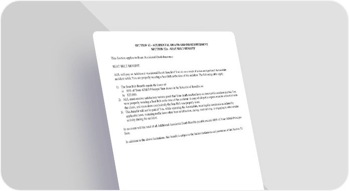 SECTION12-ACCIDENTALDEATHANDDISMEMBERMENT SECTION12A-SEATBELTBENEFIT This Section applies to Basic Accidental Death Insurance. SEATBELTBENEFIT AULwillpayanAdditionalAccidentalDeathBenefitif You die as a result of a non-occupational Automobile accident while You are properly wearing a Seat Belt at the time of the accident. The following rules apply: 1) TheSeatBeltBenefitequalsthe lesser of: a) 10%ofYourAD&DPrincipalSumshownintheScheduleofBenefits;or b) $25,000. 2) AULmustreceivesatisfactorywritten proof that Your death resulted from an Automobile accident and that You wereproperly wearing a Seat Belt at the time of the accident. A copy of all police reports must be submitted with the claim, and must show conclusively the Seat Belt was properly worn. 3) This benefit will not be paid if You, while operating the Automobile, were legally intoxicated as defined by applicable laws, violating traffic laws other than an infraction, racing, stunt-driving, or engaging in other similar activity during the accident. In no event will the total of all Additional Accidental Death Benefits payable exceed 100% of Your AD&D Principal Sum. In addition to the above limitations, this benefit is subject to the further limitations and provisions of this Section 12. GC2510.15 SECTION12-ACCIDENTALDEATHANDDISMEMBERMENT SECTION12A-SEATBELTBENEFIT