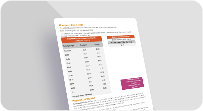 The cost for Supplement Life is calculated based on the start of the plan's current policy year. Rates shown are guaranteed until January 1, 2030. The employee cost shown below includes both insurance premium and a non-insurance fee for Bereavement Support, including Funeral Support & Estate Planning. How much does it cost? What else is included? Accelerated Death Benefit If you have a medical condition that requires permanent, continuous confinement in an institution or are diagnosed with a terminal illness with limited life expectancy, this living benefit may pay you a portion of the benefit while you are still living. Receipt of this living benefit may be taxable or may adversely affect your eligibility for Medicaid or other government benefits. You should consult with your personal tax advisor before using the Accelerated Death Benefit. Waiver of Premium benefit allows you to keep your Group Term Life Basic and Supplemental coverage for a period of time without paying premiums if you arent working because you are totally disabled. Continue (Port) or convert coverage If your employment ends or you no longer meet your employers eligibility criteria, you may have the option to continue coverage by paying premiums directly to the insurance company. You may also have the option to convert coverage into an individual Whole Life Insurance policy. Coverage for your spouse or children is also available. A complete description of benefits, limitations, exclusions and terms of coverage will be provided in the certificate of insurance and riders. Non-insurance services Bereavement Support, including Funeral Support & Estate Planning offers an impactful solution to you and your family after the loss of a loved one from planning a funeral to the logistics of winding down an estate. Empathys bereavement support is also fully accessible to your loved ones, and various family members can share and join your account. Bereavement Support, including Funeral Support & Estate Planning services are provided by The Empathy Project, Inc., New York, NY. Provisions and availability of each service may vary by state. LifeVault digital legacy planning is provided by The Empathy Project, Inc., New York, NY. Provisions and availability of each service may vary by state. Voya Travel Assistance offers you and your dependents services when traveling 100 miles or more from home, including: medical assistance services, emergency medical transport services, travel assistance services such as pre-trip and cultural information, security services and accessible technology. Voya Travel Assistance services are provided by International Medical Group, Inc. (IMG), Indianapolis, IN. All services are governed by the terms and conditions outlined in the contract between IMG and ReliaStar Life Insurance Company and ReliaStar Life Insurance Company of New York, wholly owned subsidiaries of Voya Financial, Inc. Provisions and availability may vary by state. Not sure how much you need? Try the Life Insurance Calculator at go.voya.com/lifecalc to learn more. Supplemental Life Insurance monthly rates per $1,000 of coverage Employee Age Employee Spouse Under 25 $0.04 $0.06 25-29 $0.04 $0.07 30-34 $0.06 $0.09 35-39 $0.08 $0.10 40-44 $0.10 $0.13 45-49 $0.15 $0.19 50-54 $0.23 $0.34 55-59 $0.43 $0.54 60-64 $0.61 $0.96 65-69 $1.15 $1.66 70 + $1.86 $1.66 The rates are per individual. Children Life Insurance Rates Monthly cost for all eligible children Monthly rate per $1,000 of coverage $0.10