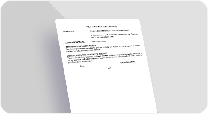 POLICY SPECIFICATIONS (Continued) PREMIUM DUE: January 1, 2022 and the first day of each calendar month thereafter. All premiums must be sent to us on or before the premium due date. The premium must be paid in United States dollars. TOBACCO RATING BASIS: Tobacco/Non-Tobacco MINIMUM PARTICIPATION REQUIREMENT The minimum participation required by the governing jurisdiction or a minimum of 5 insured employees or members, whichever is greater, is required to issue this policy. DIVISIONS, SUBSIDIARIES, OR AFFILIATED COMPANIES These are the policyholder’s divisions, subsidiaries, or affiliates listed below. The policyholder may act for and on behalf of any and all of these in all matters that pertain to this policy. Every act done by, agreement made with, or notice given to the policyholder will be binding on them. Name Location (City and State) None GWLPIN Page 3C