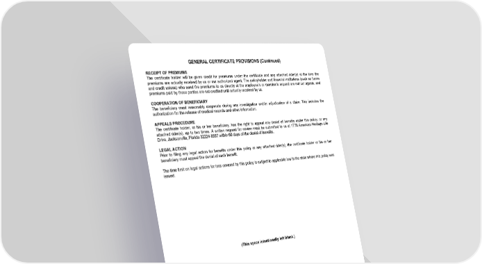 GENERAL CERTIFICATE PROVISIONS (Continued) RECEIPT OF PREMIUMS The certificate holder will be given credit for premiums under the certificate and any attached rider(s) at the time the premiums are actually received by us or our authorized agent. The policyholder and financial institutions (such as banks and credit unions) who send the premiums to us directly at the employee’s or member’s request are not our agents, and premiums paid by those parties are not credited until actually received by us. COOPERATION OF BENEFICIARY The beneficiary must reasonably cooperate during any investigation and/or adjudication of a claim. This includes the authorization for the release of medical records and other information. APPEALS PROCEDURE The certificate holder, or his or her beneficiary, has the right to appeal any denial of benefits under this policy, or any attached rider(s), up to two times. A written request for review must be submitted to us at 1776 American Heritage Life Drive, Jacksonville, Florida 32224-6687 within 60 days of the denial of benefits. LEGAL ACTION Prior to filing any legal action for benefits under this policy or any attached rider(s), the certificate holder or his or her beneficiary must appeal the denial of such benefit. The time limit on legal actions for loss covered by this policy is subject to applicable law in the state where this policy was issued. (This space intentionally left blank.) GWLPIN Page 16