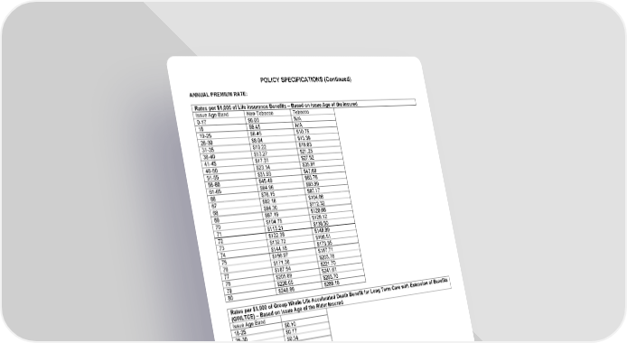 POLICY SPECIFICATIONS (Continued) ANNUAL PREMIUM RATE: Rates per $1,000 of Life Insurance Benefits – Based on Issue Age of the Insured Issue Age Band Non-Tobacco Tobacco 0-17 $6.03 N/A 18 $6.45 N/A 19-25 $6.45 $10.75 26-30 $8.04 $13.39 31-35 $10.22 $16.63 36-40 $13.27 $21.25 41-45 $17.31 $27.52 46-50 $23.14 $35.91 51-55 $31.93 $47.60 56-60 $45.49 $63.76 61-65 $64.96 $83.99 66 $76.15 $97.17 67 $82.16 $104.06 68 $94.30 $112.32 69 $97.19 $120.66 70 $104.75 $129.12 71 $113.21 $138.50 72 $122.38 $148.99 73 $132.72 $160.51 74 $144.18 $173.35 75 $156.97 $187.71 76 $171.36 $203.78 77 $187.54 $221.70 78 $205.69 $241.61 79 $226.05 $263.70 80 $248.86 $288.16 Rates per $1,000 of Group Whole Life Accelerated Death Benefit for Long Term Care with Extension of Benefits (GWLTCE) – Based on Issue Age of the Rider Insured Issue Age Band 18-25 $0.10 26-30 $0.17 31-35 $0.34 36-40 $0.65 41-45 $1.10 46-50 $1.67 51-55 $2.61 56-60 $4.14 61-65 $6.88 66-70 $9.71 GWLPIN Page 3B