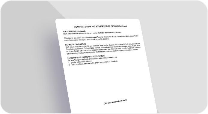 CERTIFICATE LOAN AND NON-FORFEITURE OPTIONS (Continued) NON-FORFEITURE (Continued) When a non-forfeiture option is elected, any rider(s) attached to that certificate will terminate. If the insured dies before a non-forfeiture request becomes effective, we will void the certificate holder’s request for that non-forfeiture option and pay the death benefit pursuant to this policy. METHOD OF CALCULATION Cash values and paid-up benefits are computed based on the Standard Non-forfeiture Method using the applicable Commissioners Standard Ordinary (CSO) mortality table and maximum interest rate allowed by law at the time of the certificate effective date. This method is stated in the insurance laws of the state where this policy is delivered. The values are not less than the minimums required by the Standard Non-forfeiture law of the state where the policy is delivered. PAYMENTS BY US AND RIGHT TO DEFER PAYMENT We have the right to wait up to 6 months after written notice to us before we: 1. pay the net surrender value; or 2. make a certificate loan, unless it is used to pay premiums on a certificate. (This space intentionally left blank.) GWLPIN Page 14