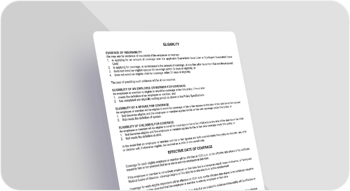ELIGIBILITY EVIDENCE OF INSURABILITY We may ask for evidence of insurability if the employee or member: 1. is applying for an amount of coverage over the applicable Guaranteed Issue Limit or Contingent Guaranteed Issue Limit; 2. is applying for coverage, or an increase in the amount of coverage, at any time after his or her initial enrollment period; 3. does not enroll an eligible spouse for coverage within 31 days of eligibility; or 4. does not enroll an eligible child for coverage within 31 days of eligibility. The cost of providing such evidence will be at our expense. ELIGIBILITY OF AN EMPLOYEE OR MEMBER FOR COVERAGE An employee or member is eligible to enroll for coverage under this policy, if he or she: 1. meets the definition of an employee or member; and 2. has completed any eligibility waiting period as shown in the Policy Specifications. ELIGIBILITY OF A SPOUSE FOR COVERAGE An employee or member will be eligible to enroll for coverage on his or her spouse on the later of the date his or her spouse: 1. first becomes eligible and the employee or member applies for his or her own coverage under this policy; or 2. first meets the definition of spouse. ELIGIBILITY OF CHILD(REN) FOR COVERAGE An employee or member will be eligible to enroll for coverage on his or her child(ren) on the later of the date his or her child: 1. first becomes eligible and the employee or member applies for his or her own coverage under this policy; or 2. first meets the definition of child. In the event that an employee or member and his or her spouse are both covered under this policy as insureds, any child or children will, if otherwise eligible, be covered as a child of one parent only. EFFECTIVE DATE OF COVERAGE Coverage for each eligible employee or member will be effective at 12:01 a.m. on the effective date shown in the certificate issued to him or her provided that he or she is actively employed on that date. If the employee or member is not actively employed on that date due to a temporary layoff, leave of absence, or Family and Medical Leave of Absence, coverage begins on the date he or she returns to active employment. Coverage for each eligible dependent will be effective at 12:01 a.m. on the effective date shown in the certificate issued to the certificate holder provided that the employee or member is actively employed on that date. Coverage for certificate rider(s) added after the effective date that are subject to evidence of insurability will be effective on the date we approve the addition of the certificate rider(s). Coverage for certificate rider(s) added after the effective date that are not subject to evidence of insurability will be effective when we receive the request to add the certificate rider(s). Coverage changes to remove rider(s) will take effect on the first day of the calendar month that immediately follows the date the employee or member requests the removal, but will not affect a payable claim that occurs prior to the effective date of the removal. GWLPIN Page 10