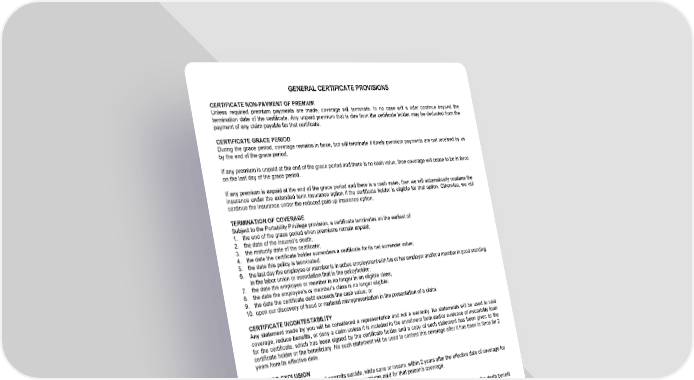 GENERAL CERTIFICATE PROVISIONS CERTIFICATE NON-PAYMENT OF PREMIUM Unless required premium payments are made, coverage will terminate. In no case will a rider continue beyond the termination date of the certificate. Any unpaid premium that is due from the certificate holder may be deducted from the payment of any claim payable for that certificate. CERTIFICATE GRACE PERIOD During the grace period, coverage remains in force, but will terminate if timely premium payments are not received by us by the end of the grace period. If any premium is unpaid at the end of the grace period and there is no cash value, then coverage will cease to be in force on the last day of the grace period. If any premium is unpaid at the end of the grace period and there is a cash value, then we will automatically continue the insurance under the extended term insurance option if the certificate holder is eligible for that option. Otherwise, we will continue the insurance under the reduced paid-up insurance option. TERMINATION OF COVERAGE Subject to the Portability Privilege provision, a certificate terminates on the earliest of: 1. the end of the grace period when premiums remain unpaid; 2. the date of the insured’s death; 3. the maturity date of the certificate; 4. the date the certificate holder surrenders a certificate for its net surrender value; 5. the date this policy is terminated; 6. the last day the employee or member is in active employment with his or her employer and/or a member in good standing in the labor union or association that is the policyholder; 7. the date the employee or member is no longer in an eligible class; 8. the date the employee’s or member’s class is no longer eligible; 9. the date the certificate debt exceeds the cash value; or 10. upon our discovery of fraud or material misrepresentation in the presentation of a claim. CERTIFICATE INCONTESTABILITY Any statement made by you will be considered a representation and not a warranty. No statements will be used to void coverage, reduce benefits, or deny a claim unless it is included in the enrollment form and/or evidence of insurability form for the certificate, which has been signed by the certificate holder and a copy of such statement has been given to the certificate holder or the beneficiary. No such statement will be used to contest this coverage after it has been in force for 2 years from its effective date. SUICIDE EXCLUSION If an insured or a rider insured commits suicide, while sane or insane, within 2 years after the effective date of coverage for that person, the death benefit is limited to the premiums paid for that person’s coverage. MISSTATEMENT OF AGE OR TOBACCO USE STATUS If the insured’s age or tobacco use status is misstated and this misstatement impacts the rate calculation, the death benefit amount will be adjusted using the correct age or tobacco use status in accordance with any applicable Internal Revenue Code requirements. In the event a certificate would not have been issued using the correct age, the certificate is void and we will refund any premiums paid for the certificate. NON-PARTICIPATING The certificates do not share in surplus distribution. GWLPIN Page 15