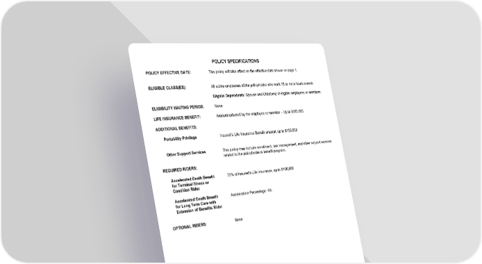 POLICY SPECIFICATIONS POLICY EFFECTIVE DATE: This policy will take effect on the effective date shown on page 1. ELIGIBLE CLASS(ES): All active employees of the policyholder who work 15 or more hours a week. Eligible Dependents: Spouse and Child(ren) of eligible employees or members. ELIGIBILITY WAITING PERIOD: None LIFE INSURANCE BENEFIT: Amount selected by the employee or member – Up to $150,000 ADDITIONAL BENEFITS: Portability Privilege Insured’s Life Insurance Benefit amount, up to $150,000 Other Support Services This policy may include enrollment, risk management, and other support services related to the policyholder’s benefit program. REQUIRED RIDERS: Accelerated Death Benefit 75% of Insured’s Life Insurance, up to $100,000 for Terminal Illness or Condition Rider Accelerated Death Benefit Acceleration Percentage: 4% for Long Term Care with Extension of Benefits Rider OPTIONAL RIDERS: None GWLPIN Page 3