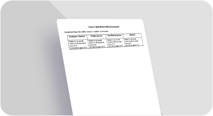 POLICY SPECIFICATIONS (Continued) Guaranteed Issue (GI) Limits: (subject to eligibility requirements) Employee or Member Working Spouse Non-Working Spouse Child(ren) Subject to an overall Subject to an overall Subject to an overall Subject to an overall maximum life insurance maximum life insurance maximum life insurance maximum life insurance amount of: amount of: amount of: amount of: $150,000 for ages 18-70 $75,000 for ages 18-70 $10,000 for ages 18-70 $20,000 for ages 0 - 18 GWLPIN Page 3A