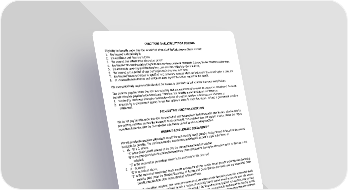 CONDITIONS ON ELIGIBILITY FOR BENEFITS Eligibility for benefits under this rider is satisfied when all of the following conditions are met: 1. the insured is chronically ill; 2. the certificate and rider are in force; 3. the insured has satisfied the elimination period; 4. the insured has used qualified long term care services and been chronically ill during the last 180 consecutive days; 5. the insured is receiving qualified long term care services while this rider is in force; 6. the insured is in a period of care that begins while this rider is in force; 7. the insured incurred charges for qualified long term care services which are included in the insured’s plan of care; and 8. all irrevocable beneficiaries and assignees have signed the written request for this benefit. We may periodically require certification that the insured is chronically ill, but not more than once every 90 days. The benefits payable under this rider are voluntary and are not intended to cause an involuntary reduction of the death benefit ultimately payable to the beneficiary. Therefore, the benefits are not available if the insured is: 1. required by law to use this option to meet the claims of creditors, whether in bankruptcy or otherwise; or 2. required by a government agency to use this option in order to apply for, obtain, or keep a government benefit or entitlement. PRE-EXISTING CONDITION LIMITATION We do not pay benefits under this rider for a period of care that begins in the first 6 months after the rider effective date if a pre-existing condition causes the insured to be chronically ill. This limitation does not apply to a period of care that begins more than 6 months after the rider effective date that is caused by a pre-existing condition. MONTHLY ACCELERATED DEATH BENEFIT We will accelerate a portion of the death benefit for each monthly benefit period or fraction thereof during which the insured is eligible for benefits. The maximum monthly accelerated death benefit amount is equal to the lesser of: 1. (A – B) x C, where: “A” is the death benefit amount on the day the elimination period is first satisfied; “B” is the total death benefit accelerated under any other rider(s) since the day the elimination period for this rider is first satisfied; “C” is the acceleration percentage shown in the certificate for this rider; and 2. A – S, where: “A” is as defined above; “S” is the sum of all accelerated death benefit amounts for all prior monthly benefit periods under this rider (excluding benefits paid under the Monthly Extension of Accelerated Death Benefits provision) and any accelerated death benefit amounts from other riders attached to the certificate. If a full month of qualified long term care services was received, we will accelerate the maximum monthly accelerated death benefit amount. If the insured is confined for only a fraction of a monthly benefit period, we will accelerate a pro rata amount for each day of confinement within that monthly benefit period. If the insured receives qualified non-confined care services less than 2 times during a monthly benefit period, we will accelerate a pro rata amount for each day of the monthly benefit period that qualified non-confined care services were received. In no instance will we accelerate more than the maximum monthly accelerated death benefit amount, as calculated above. The death benefit available for acceleration does not include the amount of any Accidental Death Benefit or Term Rider(s). If the insured satisfies the conditions stated in the Conditions on Eligibility for Benefits provision, we will pay a monthly benefit to the certificate holder upon our receipt of: 1. the certificate holder’s written request for the accelerated death benefit; 2. written certification from a licensed health care practitioner that the insured is chronically ill; and 3. signed consent from any irrevocable beneficiary or assignee. The monthly benefit payable to the certificate holder as a result of the monthly acceleration of death benefit is equal to: 1. the monthly accelerated death benefit amount; less 2. a pro rata portion (based on the monthly accelerated death benefit amount) of the certificate debt, if any; less 3. any due and unpaid premium. GWPLTCE1IN Page 5