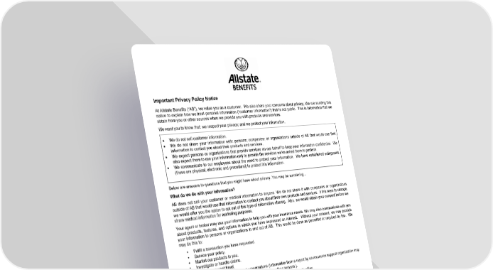 Important Privacy Policy Notice At Allstate Benefits (“AB”), we value you as a customer. We also share your concerns about privacy. We are sending this notice to explain how we treat personal information (“customer information”) that is not public. This is information that we obtain from you or other sources when we provide you with products and services. We want you to know that: we respect your privacy; and we protect your information. • We do not sell customer information. • We do not share your information with: persons; companies; or organizations outside of AB that would use that information to contact you about their products and services. • We expect persons or organizations that provide services on our behalf to keep your information confidential. We also expect them to use your information only to provide the services we’ve asked them to perform. • We communicate to our employees about the need to protect your information. We have established safeguards (these are physical, electronic and procedural) to protect this information. Below are answers to questions that you might have about privacy. You may be wondering... What do we do with your information? AB does not sell your customer or medical information to anyone. We do not share it with companies or organizations outside of AB that would use that information to contact you about their own products and services. If this were to change, we would offer you the option to opt out of this type of information sharing. Also, we would obtain your consent before we share medical information for marketing purposes. Your agent or broker may use your information to help you with your insurance needs. We may also communicate with you about products, features, and options in which you have expressed an interest. Without your consent, we may provide your information to persons or organizations in and out of AB. This would be done as permitted or required by law. We may do this to: • Fulfill a transaction you have requested. • Service your policy. • Market our products to you. • Investigate or handle claims. • Detect or prevent fraud. • Participate in insurance support organizations (Information from a report by an insurance support organization may be retained by that organization and distributed to other persons.). • Comply with lawful requests from regulatory and law enforcement authorities. These persons or organizations may include: • Our affiliated companies. • Companies that perform services, including marketing, on our behalf. • Other financial institutions with which we have an agreement for the sale of financial products. • Other insurance companies to perform their role in an insurance transaction involving you. • Businesses that conduct actuarial or research studies. • Persons requesting information pursuant to a subpoena or court order. • Your agent or broker. • An employer, if your premiums are payroll deducted. • The creditor who sold you insurance, if your policy is credit insurance. GLBNAHL 8/11