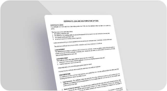 CERTIFICATE LOAN AND NON-FORFEITURE OPTIONS CERTIFICATE LOANS If a certificate is in force and has a loan value greater than $100, then the certificate holder may take a loan under this policy. The loan value is the cash value minus: 1. the existing certificate debt; 2. the interest on the existing certificate debt and the amount to be borrowed to the next certificate anniversary date; 3. any unpaid monthly premiums; and 4. an amount equal to 2 monthly premium payments. Loans are evidenced by our check payable to and endorsed by the certificate holder, or electronic versions of the same. The minimum certificate loan amount is $100, unless it is used to pay premiums on a certificate. LOAN INTEREST The interest we will charge on certificate debt is shown in the certificate. Interest on certificate debt is due and payable in arrears at the end of each certificate anniversary date. Interest not paid when due will be added to the existing certificate debt and bear interest at the same rate. LOAN REPAYMENT The certificate holder may repay certificate debt at any time, except that: 1. repayment must be made while the certificate is in force and while the insured is living; and 2. a partial repayment must be at least $25. A loan that exists at the end of the grace period cannot be repaid. If at any time the certificate debt exceeds the cash value, the certificate terminates. NON-FORFEITURE If a certificate is in force and has a net surrender value greater than zero, then the certificate holder may select one of the following non-forfeiture options by written request: 1. Cash Surrender. The certificate holder may surrender his or her certificate to receive the net surrender value. If a certificate is surrendered during the grace period, the net surrender value will not be less than the net surrender value on the premium due date. 2. Reduced Paid-Up Insurance. The reduced paid-up death benefit will be the death benefit amount divided by 1,000, then multiplied by the reduced paid-up amount shown in the Table of Guaranteed Values in the certificate. Any outstanding loans will be continued. No further premiums are required. Coverage is still subject to the Termination of Coverage provision of this policy. Once elected, the reduced paid-up insurance option can be surrendered at any time. The surrender is effective on the date we receive the certificate holder’s written request. Once the reduced paid-up insurance is surrendered, it cannot be reversed. 3. Extended Term Insurance. The net surrender value is used as a net single premium to purchase extended term insurance for a limited period for the insured. The amount of extended term insurance is the certificate death benefit amount on the date the extended term insurance becomes effective. No further premiums are required. The extended term insurance is not available if the certificate is rated. Coverage is still subject to the Termination of Coverage provision of this policy. Once elected, the extended term insurance option can be surrendered at any time. The surrender is effective on the date we receive the certificate holder’s written request. Once the extended term insurance is surrendered it cannot be reversed. GWLPIN Page 13