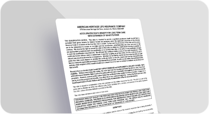 AMERICAN HERITAGE LIFE INSURANCE COMPANY 1776 American Heritage Life Drive, Jacksonville, Florida 32224-6687 ACCELERATED DEATH BENEFIT FOR LONG TERM CARE WITH EXTENSION OF BENEFITS RIDER TAX QUALIFICATION NOTICE: This rider is intended to provide a qualified accelerated death benefit that is excluded from gross income for federal income tax purposes under the applicable provisions of the Internal Revenue Code in existence at the time this rider is issued. To that end, the provisions of this rider and the policy are to be interpreted to ensure or maintain such tax qualification, notwithstanding any other provision to the contrary. We reserve the right to amend this rider or the policy to reflect any clarifications that may be needed or are appropriate to maintain such tax qualification or to conform this rider or the policy to any applicable changes in such tax qualification requirements. We will send the certificate holder a copy of any such amendment. If the certificate holder refuses such an amendment, it must be by giving us written notice, and the certificate holder’s refusal may result in adverse tax consequences. Whether any tax liability may be incurred when benefits are paid under this rider could depend on whether the certificate holder is also the insured and how the Internal Revenue Service interprets applicable provisions of the Internal Revenue Code. As with any tax matter, the certificate holder and any other recipient of this benefit should each consult his or her own tax advisor to evaluate any tax impact of this benefit. Receipt of an accelerated death benefit MAY AFFECT MEDICAID and SUPPLEMENTAL SECURITY INCOME (“SSI”) eligibility. Without exercising this option, the mere fact that this Accelerated Death Benefit for Long Term Care with Extension of Benefits Rider is part of the policy will not in and of itself affect the eligibility for these government programs. However, exercising this option before the certificate holder applies for these programs, or when he or she is receiving government benefits, may affect his or her continued eligibility. Contact the Medicaid Unit of the local Department of Public Welfare and Social Security Administration Office for more information. This rider is issued in consideration of the rider premium and the written request for this rider. This rider is a part of the policy and is effective as of the rider effective date. Every definition, term, condition, and provision of the policy applies to this rider, unless otherwise defined or provided in this rider. This rider does not have a cash value or loan value. THIS RIDER DOES NOT QUALIFY FOR MEDICAID ASSET PROTECTION UNDER THE INDIANA LONG TERM CARE PROGRAM. HOWEVER, THIS RIDER IS AN APPROVED ACCELERATED DEATH BENEFIT FOR LONG TERM CARE RIDER UNDER STATE INSURANCE REGULATIONS. FOR INFORMATION ABOUT POLICIES AND CERTIFICATES QUALIFYING UNDER THE INDIANA LONG TERM CARE PROGRAM, CALL THE SENIOR HEALTH INSURANCE INFORMATION PROGRAM OF THE DEPARTMENT OF INSURANCE AT 1-800-452-4800. DEFINITIONS Activities of daily living (ADLs) mean activities used to measure the insured’s impairment due to being chronically ill. ADLs are any of the following: 1. Bathing – washing oneself by sponge bath; or in either a tub or shower, including the act of getting into and out of the tub or shower, with or without the aid of equipment. 2. Continence – the ability to maintain control of bowel and bladder function; or when unable to maintain control of bowel or bladder function, the ability to perform associated personal hygiene (including caring for catheter or colostomy bag), with or without the aid of equipment. 3. Dressing – putting on and taking off all items of clothing and any necessary braces, fasteners or artificial limbs. 4. Eating – feeding oneself by getting food into the body from a receptacle (such as a plate, cup or table) or by a feeding tube or intravenously. 5. Toileting – getting to and from the toilet, getting on and off the toilet, and performing associated personal hygiene. 6. Transferring – the ability to move into or out of a bed, chair or wheelchair. Adult day care means a program for 6 or more individuals, of social and health-related services provided during the day in a community group setting for the purpose of supporting persons who are chronically ill and can benefit from care in a group setting outside the home. Adult day care center means a facility or part of a facility that provides adult day care and is appropriately licensed or certified to provide such services (if required by the jurisdiction in which it is operating). GWPLTCE1IN Page 1
