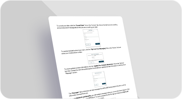 To cancel your claim, click the “Cancel Claim” link on the “Actions” tab, choose the claim you are cancelling and provide a brief message about why you are cancelling your claim. To receive text alerts about your claim, click the “Opt in to Text Messaging” link on the “Actions” tab and enter your mobile phone number. To share updated contact information, click the “Update Your Contact Information” link on the “Actions” tab, then choose the claim the update applies to and add your updated contact information to the free-form “Message” section. The “Messages” tab is where you can see messages from NYL GBS that are tied to this claim, such as information we need from you. If you are eligible for paid benefits, you will receive a message noting you can enroll in direct deposit. Click the “Electronic Fund Transfer (EFT) form” link and complete the form to sign up to have any eligible paid benefits directly deposited into the noted bank account. Eff. 01/2024