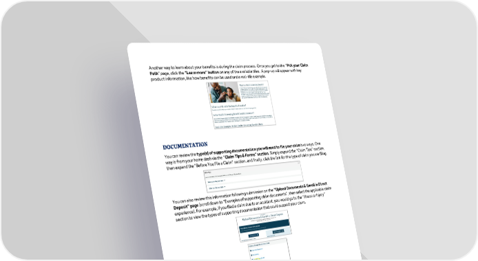 Another way to learn about your benefits is during the claim process. Once you get to the “Pick your Claim Path” page, click the “Learn more” button on any of the available tiles. A pop-up will appear with key product information, like how benefits can be used and a real-life example. You can review the type(s) of supporting documentation you will need to file your claim two ways. One way is from your home dash via the “Claim Tips & Forms” section. Simply expand the “Claim Tips” section, then expand the “Before You File a Claim” section, and finally, click the link for the type of claim you are filing. You can also review this information following submission on the “Upload Documents & Enroll in Direct Deposit” page (scroll down to “Examples of supporting claim documents”, then select the applicable claim experience). For example, if you filed a claim due to an accident, you would go to the “Illness or Injury” section to view the types of supporting documentation that could support your claim. To download a specific claim form or document, go to the “Forms & Information” section on your home dashboard. Click the “+” in the “Forms & Information” section to see the forms associated with the various products, then select the respective document to download it. Once completed, you can upload the form to your claim, or mail or fax it to us. Eff. 01/2024