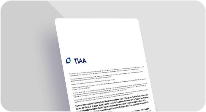 16 This material is for informational or educational purposes only and is not fiduciary investment advice, or a securities, investment strategy, or insurance product recommendation. This material does not consider an individual’s own objectives or circumstances which should be the basis of any investment decision. This material does not take into account any specific objectives or circumstances of any particular investor, or suggest any specific course of action. Investment decisions should be made based on the investor’s own objectives and circumstances. Interests in any retiree healthcare plan discussed herein are offered solely by the employer. Teachers Insurance and Annuity Association of America (TIAA) will provide services to the plan and may issue plan communications on behalf of the plan sponsor, in its capacity as a plan recordkeeper. As with all mutual funds, the principal value of a Lifecycle Fund isn’t guaranteed at any time, including at the target date, and will fluctuate with market changes. The target date approximates when investors may plan to start making withdrawals. However, you are not required to withdraw the funds at that target date. After the target date has been reached, some of your money may be merged into a fund with a more stable asset allocation. Lifecycle Funds share the risks associated with the types of securities held by each of the underlying funds in which they invest. In addition to the fees and expenses associated with the Lifecycle Funds, there is exposure to the fees and expenses associated with the underlying mutual funds. You could lose money by investing in the Nuveen Money Market Fund. Although the Fund seeks to preserve the value of the shares at $1.00 per share, it cannot guarantee it will do so. An investment in the Fund is not insured or guaranteed by the Federal Deposit Insurance Corporation or any other government agency. The Fund’s sponsor has no legal obligation to provide support to the Fund, and you should not expect that the sponsor will provide financial support to the Fund at any time. Investing may not be suitable for everyone. You should consider the investment objectives, risks, charges and expenses carefully before investing. Please call 877-518-9161 or go to www.TIAA.org/prospectuses for current product and fund prospectuses that contain this and other information. Please read the prospectuses carefully before investing. The TIAA group of companies does not provide legal or tax advice. Please consult your legal or tax advisor. TIAA products may be subject to market and other risk factors. See the applicable product literature, or visit tiaa.org for details. Investment, insurance, and annuity products are not FDIC insured, are not bank guaranteed, are not deposits, are not insured by any federal government agency, are not a condition to any banking service or activity, and may lose value. ©2025 Teachers Insurance and Annuity Association of America-College Retirement Equities Fund, 730 Third Ave., New York, NY 10017 3892804-1025 4219358-0326 (02/2025)