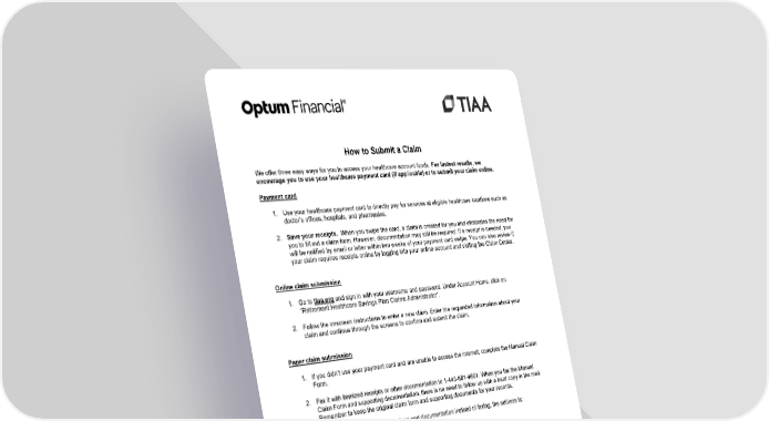 How to Submit a Claim We offer three easy ways for you to access your healthcare account funds. For fastest results, we encourage you to use your healthcare payment card (if applicable) or to submit your claim online. Payment card 1. Use your healthcare payment card to directly pay for services at eligible healthcare locations such as doctor’s offices, hospitals, and pharmacies. 2. Save your receipts. When you swipe the card, a claim is created for you and eliminates the need for you to fill out a claim form. However, documentation may still be required. If a receipt is needed, you will be notified by email or letter within two weeks of your payment card swipe. You can also review if your claim requires receipts online by logging into your online account and visiting the Claim Center. Online claim submission 1. Go to tiaa.org and sign in with your username and password. Under Account Home, click on “Retirement Healthcare Savings Plan Claims Administrator”. 2. Follow the onscreen instructions to enter a new claim. Enter the requested information about your claim and continue through the screens to confirm and submit the claim. Paper claim submission 1. If you didn’t use your payment card and are unable to access the internet, complete the Manual Claim Form. 2. Fax it with itemized receipts or other documentation to 1-443-681-4601. When you fax the Manual Claim Form and supporting documentation, there is no need to follow up with a hard copy in the mail. Remember to keep the original claim form and supporting documents for your records. 3. If you choose to mail your claim form and documentation instead of faxing, the address is: Claims service center P.O. Box 622337 Orlando, FL 32862-2337 © 2024 Optum, Inc. All rights reserved. 136897B-052024