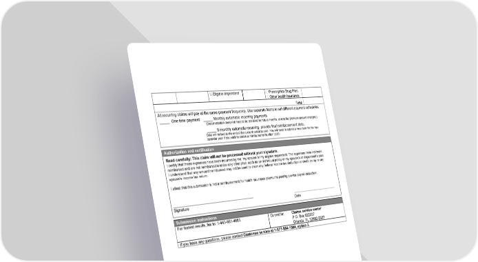 © 2024 Optum, Inc. All rights reserved. 136897B-052024 � Eligible dependent � Prescription Drug Plan � Other health insurance Total All recurring claims will pay at the same payment frequency. Use separate forms to set different payment schedules. _____ One time payment _____ Monthly automatic recurring payments (Documentation does not need to be provided for future months, unless the premium amount changes.) _____ If monthly automatic recurring, provide final reimbursement date. Date will default to the end of the current calendar year. You will need to submit a new claim for the new calendar year if you wish to continue reimbursements after 12/31. Authorization and certification Read carefully: This claim will not be processed without your signature. I certify that these expenses have been incurred by me, my spouse or my eligible dependent. The expenses have not been reimbursed and are not reimbursable under any other plan, such as an individual policy or my spouse’s or dependent’s plan. I understand that any amount reimbursed may not be used to claim any federal income tax deduction or credit on my or my spouse’s income tax return. I attest that this submission is not a reimbursement for health insurance premiums paid by pre-tax payroll deduction. Signature Date Submission instructions For fastest results, fax to: 1-443-681-4601 Or mail to: Claims service center P.O. Box 622337 Orlando, FL 32862-2337 If you have any questions, please contact Customer service at 1-877-554-1004, option 2.
