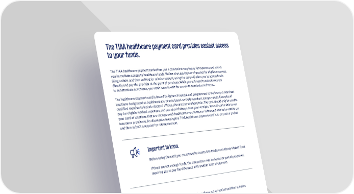 5 1. 2. 3. Move your money into the Nuveen Money Market Mutual Fund. Submit your claim online, through the mobile app, or by returning a paper claim form in the mail or by fax. Have your reimbursement deposited into your bank account or be sent a check. If you prefer not to use the healthcare payment card, you’ll pay out-of-pocket and then submit a request for reimbursement. The TIAA healthcare payment card provides easiest access to your funds. The TIAA healthcare payment card offers you a convenient way to pay for expenses and allows you immediate access to healthcare funds. Rather than paying out-of-pocket for eligible expenses, filing a claim and then waiting for reimbursement, using the card will allow you to access funds directly and pay the provider at the point of purchase. While you still need to submit receipts to substantiate purchases, you won’t have to wait for money to be reimbursed to you. The healthcare payment card is issued by Optum Financial and programmed to work only at merchant locations designated as healthcare merchants based on their merchant category code. Examples of qualified merchants include doctors’ offices, pharmacies and hospitals. The card should only be used to pay for eligible medical expenses, and you should always save your receipts. You will not be able to use your card at locations that are not approved healthcare merchants, nor is the card able to be used to pay insurance premiums. An alternative to using the TIAA healthcare payment card is to pay out of pocket and then submit a request for reimbursement. Important to know. Before using the card, you must transfer assets into the Nuveen Money Market Fund. If there are not enough funds, the transaction may be denied or partially approved, requiring you to pay the difference with another form of payment.
