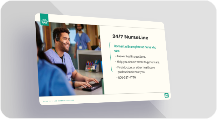 24/7 NurseLine Connect with a registered nurse who can: ◦ Answer health questions. ◦ Help you decide where to go for care. ◦ Find doctors or other healthcare professionals near you. ◦ 800-337-4770 19 PAGE 19 | LHD BENEFIT ADVISORS