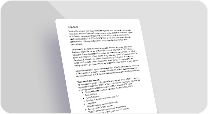5 Social Media Social media can mean many things in a rapidly expanding world of electronic communication. Social media includes all means of communicating or posting information or content of any sort on the Internet, including a web log or blog, personal website, soci al networking website, whether or not associated or affiliated with HCCSC, as well as any other form of electronic communication. Ultimately, individuals are solely responsible for all forms of online communication. Online behavior should reflect community standards of honesty, respect and consideration. Employees may not disclose any confidential information pertaining to HCCSC, including information about students and/or their families. An employee should not “fri end” or “follow” a current student that is not a family member on a personal site. “Friending” parents or students is discouraged as it blurs the line between the personal and professional life. If a n employee utilizes social media for a school club or s chool related activity, it is encouraged that the employee creates a group page for that group as opposed to “friend requests” for group members. Any conduct online or in a public forum that adversely affects job performance, the performance of fellow associates or otherwise adversely affects HCCSC students, staff, administration or others associated with HCCSC may result in disciplinary action up to and including termination. Motor Vehicle Requirements An employee must possess a valid Indiana Driver’s License if driving an HCCSC vehicle is a requirement of the position. The following is a list of offenses, occurring any time in the last seven ( 7) years that would be deemed unacceptable to drive an HCCSC vehicle: • Driving while under the influence/driving while intoxicated (DUI/DWI) • Reckless driving • Suspended license • Speeding 25 mph or more above the speed limit • Drug offense • Hit and run/leaving the scene of an accident • Two (2) or more “at fault” accidents • Three (3) or more moving violations in the past 3 years • Less than one (1) year of driving experience with violations • Vehicular homicide • An “at fault” accident assigned eight ( 8) or more points Any employee who is charged with a Driving Under the Influence, Operating While Intoxicated, or reckless driving offense may be terminated if that position requires them to drive an HCCSC vehicle. HCCSC requires a copy of driver’s license, proof of insurance and authorization to pull Motor Vehicle Records. Record Retention Procedures for obtaining the approval to destroy school records are the same for destroying other public records. Each building should have the Retention Schedule that is dated April 26, 2023. The retention schedule for HCCSC dictates how long to keep each type of record. Specific questions should be directed to the Chief Financial Officer or designee. Employees may not