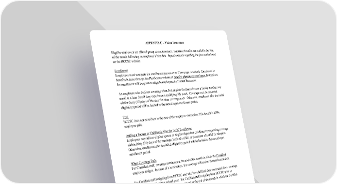 12 APPENDIX C – Vision Insurance Eligible employees are offered group vision insurance. Insurance benefits are available the first of the month following an employee’s hire date. Specific details regarding the plan can be found on the HCCSC website. Enrollment Employees must complete the enrollment process even if coverage is waived. Enrollment in benefits is done through the PlanSource website at benefits.plansource.com/logon. Instructions for enrollment will be given to eligible employees by Human Resources . An employee who declines coverage when first eligible for themselves or a family member may enroll at a later date if they experience a qualifying life event. Coverage must be requested within thirty ( 30) days of the date the other coverage ends. Otherwise, enrollment after the initial eligibility period will be limited to the annual open enrollment period. Cost HCCSC does not contribute to the cost of the employee vision plan. This benefit is 100% employee paid . Adding a Spouse or Child(ren) After the Initial Enrollment Employees may add an eligible spouse or eligible dependent child(ren) by requesting coverage within thirty ( 30) days of the marriage, birth of a child, or placement of a child for adoption. Otherwise, enrollment after the initial eligibility period will be limited to the annual open enrollment period. When Coverage Ends For Classified staff, c overage terminates at the end of the month in which the Classified employee resigns. In cases of a termination, the coverage will end on the termination date. For Certified staff resigning from HCCSC and who have fulfilled their contracted days, coverage will end August 31 of that school year. For Certified staff resigning from HCCSC prior to fulfilling their contracted days, coverage will end at the end of the month in which the Certified employee resigns. For dependent children, coverage will end at midnight of the last day of the calendar year in which the child is 26 years of age.