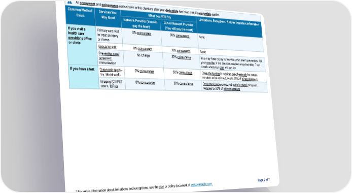 Page 2 of 7 * For more information about limitations and exceptions, see the plan or policy document at welcometouhc.com. All copayment and coinsurance costs shown in this chart are after your deductible has been met, if a deductible applies. Common Medical Event Services You May Need What You Will Pay Limitations, Exceptions, & Other Important Information Network Provider (You will pay the least) Out-of-Network Provider (You will pay the most) If you visit a health care provider’s office or clinic Primary care visit to treat an injury or illness 0% coinsurance 30% coinsurance None Specialist visit 0% coinsurance 30% coinsurance None Preventive care/ screening/ immunization No Charge 30% coinsurance You may have to pay for services that aren’t preventive. Ask your provider if the services needed are preventive. Then check what your plan will pay for. If you have a test Diagnostic test (x- ray, blood work) 0% coinsurance 30% coinsurance Preauthorization is required out-of-network for certain services or benefit reduces to 50% of allowed amount. Imaging (CT/PET scans, MRIs) 0% coinsurance 30% coinsurance Preauthorization is required out-of-network or benefit reduces to 50% of allowed amount.