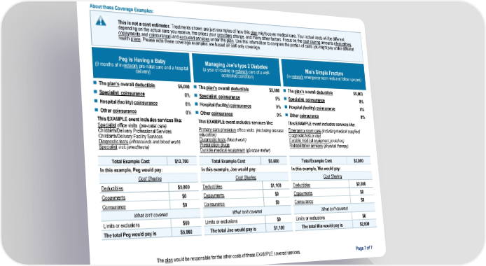 The plan would be responsible for the other costs of these EXAMPLE covered services. Page 7 of 7 Peg is Having a Baby (9 months of in-network pre-natal care and a hospital delivery) The plan’s overall deductible Specialist coinsurance Hospital (facility) coinsurance Other coinsurance Managing Joe’s type 2 Diabetes (a year of routine in-network care of a well- controlled condition) The plan’s overall deductible Specialist coinsurance Hospital (facility) coinsurance Other coinsurance Mia’s Simple Fracture (in-network emergency room visit and follow up care) The plan’s overall deductible Specialist coinsurance Hospital (facility) coinsurance Other coinsurance Cost Sharing Deductibles $5,000 Copayments $0 Coinsurance $0 What isn’t covered Limits or exclusions $60 The total Peg would pay is $5,060 Cost Sharing Deductibles $1,100 Copayments $0 Coinsurance $0 What isn’t covered Limits or exclusions $0 The total Joe would pay is $1,100 Cost Sharing Deductibles $2,800 Copayments $0 Coinsurance $0 What isn’t covered Limits or exclusions $0 The total Mia would pay is $2,800 This is not a cost estimator. Treatments shown are just examples of how this plan might cover medical care. Your actual costs will be different depending on the actual care you receive, the prices your providers charge, and many other factors. Focus on the cost sharing amounts (deductibles, copayments and coinsurance) and excluded services under the plan. Use this information to compare the portion of costs you might pay under different health plans. Please note these coverage examples are based on self-only coverage. About these Coverage Examples: $5,000 0% 0% 0% This EXAMPLE event includes services like: $5,000 0% 0% 0% This EXAMPLE event includes services like: This EXAMPLE event includes services like: $5,000 0% 0% 0% Specialist office visits (pre-natal care) Childbirth/Delivery Professional Services Childbirth/Delivery Facility Services Diagnostic tests (ultrasounds and blood work) Specialist visit (anesthesia) Primary care physician office visits (including disease education) Diagnostic tests (blood work) Prescription drugs Durable medical equipment (glucose meter) Emergency room care (including medical supplies) Diagnostic test (x-ray) Durable medical equipment (crutches) Rehabilitation services (physical therapy) In this example, Peg would pay: In this example, Joe would pay: In this example, Mia would pay: Total Example Cost $12,700 Total Example Cost $5,600 $2,800 Total Example Cost