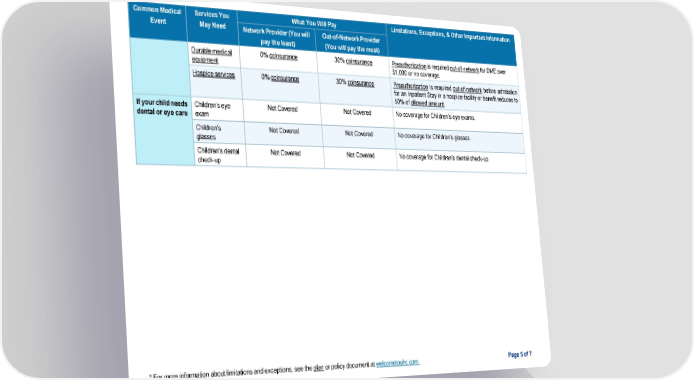 Page 5 of 7 * For more information about limitations and exceptions, see the plan or policy document at welcometouhc.com. Common Medical Event Services You May Need What You Will Pay Limitations, Exceptions, & Other Important Information Network Provider (You will pay the least) Out-of-Network Provider (You will pay the most) Durable medical equipment 0% coinsurance 30% coinsurance Preauthorization is required out-of-network for DME over $1,000 or no coverage. Hospice services 0% coinsurance 30% coinsurance Preauthorization is required out-of-network before admission for an Inpatient Stay in a hospice facility or benefit reduces to 50% of allowed amount. If your child needs dental or eye care Children’s eye exam Not Covered Not Covered No coverage for Children’s eye exams. Children’s glasses Not Covered Not Covered No coverage for Children’s glasses. Children’s dental check-up Not Covered Not Covered No coverage for Children’s dental check-up.