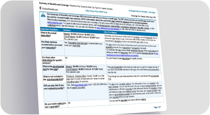 The Summary of Benefits and Coverage (SBC) document will help you choose a health plan. The SBC shows you how you and the plan would share the cost for covered health care services. NOTE: Information about the cost of this plan (called the premium) will be provided separately. This is only a summary. For more information about your coverage, or to get a copy of the complete terms of coverage, call 1-833-354-0944 or visit welcometouhc.com. For general definitions of common terms, such as allowed amount, balance billing, coinsurance, copayment, deductible, provider, or other underlined terms, see the Glossary. You can view the Glossary at www.healthcare.gov/sbc-glossary/ or call 1-866-487-2365 to request a copy. Summary of Benefits and Coverage: What this Plan Covers & What You Pay For Covered Services Coverage Period: 01/01/2026 – 12/31/2026 HSA Choice Plus HDHP Core Coverage For: Family | Plan Type: PS1 Important Questions Answers Why This Matters: What is the overall deductible? Network: $2,200 Individual / $4,400 Family Out-of-Network: $4,400 Individual / $8,800 Family Per calendar year. Generally, you must pay all of the costs from providers up to the deductible amount before this plan begins to pay. If you have other family members on the plan, the overall family deductible must be met before the plan begins to pay. Are there services covered before you meet your deductible? Yes. Preventive Care Services is covered before you meet your deductible. This plan covers some items and services even if you haven’t yet met the annual deductible amount. But a copayment or coinsurance may apply. For example, this plan covers certain preventive services without cost-sharing and before you meet your deductible. See a list of covered preventive services at www. healthcare.gov/coverage/preventive-care-benefits/. Are there other deductibles for specific services? No. You don’t have to meet deductibles for specific services. What is the out-of-pocket limit for this plan? Network: $4,400 Individual / $8,800 Family Out-of-Network: $8,800 Individual / $17,600 Family Per calendar year. The out-of-pocket limit is the most you could pay in a year for covered services. If you have other family members in this plan, the overall family out-of-pocket limits must be met What is not included in the out-of-pocket limit? Premiums, balance-billing charges, health care this plan doesn’t cover and penalties for failure to obtain preauthorization for services. Even though you pay these expenses, they don’t count toward the out-of-pocket limit. Will you pay less if you use a network provider? Yes. See www.myuhc.com or call 1-833-354-0944 for a list of network providers. This plan uses a provider network. You will pay less if you use a provider in the plan's network. You will pay the most if you use an out-of-network provider, and you might receive a bill from a provider for the difference between the provider’s charge and what your plan pays (balance billing). Be aware, your network provider might use an out-of-network provider for some services (such as lab work). Check with your provider before you get services. Do you need a referral to see a specialist? No You can see the specialist you choose without a referral. Page 1 of 7