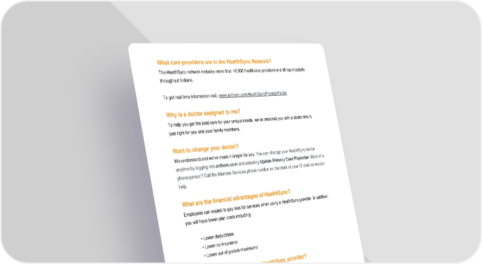What care providers are in the HealthSync Network? The HealthSync network includes more than 10,000 healthcare providers and 45 top hospitals throughout Indiana. To get real time information visit: www.anthem.com/HealthSyncProviderFinder Why is a doctor assigned to me? To help you get the best care for your unique needs, we’ve matched you with a doctor that is just right for you and your family members. Want to change your doctor? We understand and we’ve made it simple for you. You can change your HealthSync doctor anytime by logging into anthem.com and selecting Update Primary Care Physician. More of a phone person? Call the Member Services phone number on the back of your ID card so we can help. What are the financial advantages of HealthSync? Employees can expect to pay less for services when using a HealthSync provider. In addition, you will have lower plan costs including: • Lower deductibles • Lower co-insurance • Lower out-of-pocket maximums What happens if I go to a non-HealthSync provider? $ $ $ $ $ $ HealthSync In-Network Out-of-Network For the best doctors and Members who go out of Members that go to a most cost-effective health the HealthSync network doctor that is not in care, members are may utilize all other HealthSync or Anthem’s strongly encouraged to Anthem Blue Access Blue Access network will stay in the HealthSync PPO doctors at a higher result in the highest network. cost share. out-of-pocket costs