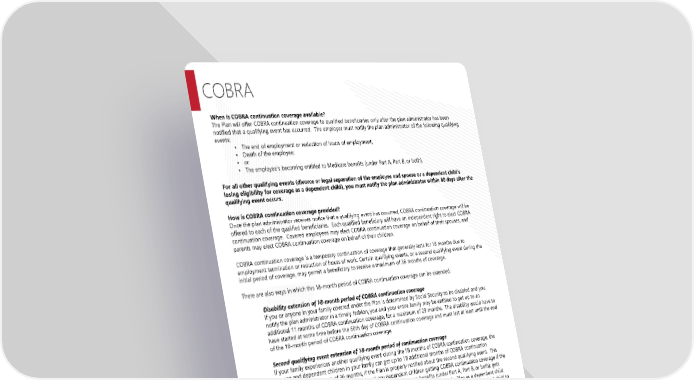 COBRA When is COBRA continuation coverage available? The Plan will offer COBRA continuation coverage to qualified beneficiaries only after the plan administrator has been notified that a qualifying event has occurred. The employer must notify the plan administrator of the following qualifying events: • The end of employment or reduction of hours of employment; • Death of the employee; • or • The employee’s becoming entitled to Medicare benefits (under Part A, Part B, or both). For all other qualifying events (divorce or legal separation of the employee and spouse or a dependent child’s losing eligibility for coverage as a dependent child), you must notify the plan administrator within 60 days after the qualifying event occurs. How is COBRA continuation coverage provided? Once the plan administrator receives notice that a qualifying event has occurred, COBRA continuation coverage will be offered to each of the qualified beneficiaries. Each qualified beneficiary will have an independent right to elect COBRA continuation coverage. Covered employees may elect COBRA continuation coverage on behalf of their spouses, and parents may elect COBRA continuation coverage on behalf of their children. COBRA continuation coverage is a temporary continuation of coverage that generally lasts for 18 months due to employment termination or reduction of hours of work. Certain qualifying events, or a second qualifying event during the initial period of coverage, may permit a beneficiary to receive a maximum of 36 months of coverage. There are also ways in which this 18-month period of COBRA continuation coverage can be extended: Disability extension of 18-month period of COBRA continuation coverage If you or anyone in your family covered under the Plan is determined by Social Security to be disabled and you notify the plan administrator in a timely fashion, you and your entire family may be entitled to get up to an additional 11 months of COBRA continuation coverage, for a maximum of 29 months. The disability would have to have started at some time before the 60th day of COBRA continuation coverage and must last at least until the end of the 18-month period of COBRA continuation coverage. Second qualifying event extension of 18-month period of continuation coverage If your family experiences another qualifying event during the 18 months of COBRA continuation coverage, the spouse and dependent children in your family can get up to 18 additional months of COBRA continuation coverage, for a maximum of 36 months, if the Plan is properly notified about the second qualifying event. This extension may be available to the spouse and any dependent children getting COBRA continuation coverage if the employee or former employee dies; becomes entitled to Medicare benefits (under Part A, Part B, or both); gets divorced or legally separated; or if the dependent child stops being eligible under the Plan as a dependent child. This extension is only available if the second qualifying event would have caused the spouse or dependent child to lose coverage under the Plan had the first qualifying event not occurred. Are there other coverage options besides COBRA Continuation Coverage? Yes. Instead of enrolling in COBRA continuation coverage, there may be other coverage options for you and your family , or other group through the Health Insurance Marketplace, Medicare, Medicaid, Children’s Health Insurance Program (CHIP) health plan coverage options (such as a spouse’s plan) through what is called a “special enrollment period.” Some of these options may cost less than COBRA continuation coverage. You can learn more about many of these options at www.healthcare.gov. Page 20 Huntington County Community School Corporation 2025 Plan Year This Compliance Overview is not intended to be exhaustive nor should any discussion or opinions be construed as legal advice. Readers should contact legal counsel for legal advice.