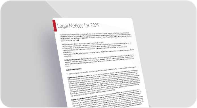 Legal Notices for 2025 The Plan may disclose your PHI to the proper authorities for law enforcement purposes, including the disclosure of certain identifying information requested by police officers for the purpose of identifying or locating a suspect, fugitive, material witness or missing person; the disclosure of your PHI if you are suspected to be a victim of a crime and you are incapacitated; or if you are suspected of committing a crime on the Plan (e.g., fraud). The Plan may use or disclose PHI to avert a serious threat to health or safety. The Plan may use or disclose your PHI if you are a member of the military, as required by armed forces services, and the Plan may also disclose your PHI for other specialized government functions such as national security or intelligence activities. The Plan may disclose your PHI to state or federal workers’ compensation agencies for your workers’ compensation benefit determination. The Plan may, as required by law, release your PHI to the Secretary of Department Health and Human Services for enforcement of HIPAA Privacy Rules. Verification Requirement – Before the Plan discloses your PHI to anyone requesting it, the Plan is required to verify the identity of the requester’s authority to access your PHI. The Plan may rely on reasonable evidence of authority such as a badge, official credentials, written statements on appropriate government letterhead, written or oral statements of legal authority, warrants, subpoenas, or court orders. RIGHTS THAT YOU HAVE To request to inspect, copy, amend or get accounting of PHI pertaining to your PHI in the Plan, you may contact the plan administrator. Right to Inspect and Copy your PHI – You have the right to request a copy of and/or to inspect your PHI that the Plan maintains, unless the PHI was compiled in reasonable anticipation of litigation or contains psychotherapy notes. In certain limited circumstances, the Plan may deny your request to copy and/or inspect your PHI. In most of those limited circumstances, a licensed health care provider must determine that the release of the PHI to you or a person authorized by you, as your “personal representative,” may cause you or someone else identified in the PHI harm. If your request is denied, you may have the right to have the denial reviewed by a designated licensed health care professional that did not participate in the original decision. Request for access to your PHI must be in writing and signed by you or your personal representative. You must ask for a Participant PHI Inspection Form from the Plan through the plan administrator. If you request that the Plan copy or mail your PHI to you, the Plan may charge you a fee for the cost of copying your PHI and the postage for mailing your PHI to you. If you as the Plan to prepare a summary of PHI, and the Plan agrees to provide that explanation, the Plan may also charge you for the cost associated with the preparation of the summary. Right to Request Amendments to Your PHI – You have the right to request that PHI the Plan maintains about you be amended or corrected. The Plan is not obligated to make requested amendments to PHI that is not created by the Plan, not maintained by the Plan, not available for inspection, or that is accurate and complete. The Plan will give each request careful consideration. To be considered, your amendment request must be in writing, must be signed by you or your personal representative, must state the reasons for the amendment request, and must be sent to the Privacy Office at the address below. If the Plan denies your amendment request, the Plan will provide you with its basis for the denial, advise you of your right to prepare a statement of disagreement which it will place with your PHI, and describe how you may file a complaint with the Plan or the Secretary of the US Department of Health and Human Services. The Plan may limit the length of your statement of disagreement and submit its own rebuttal to accompany your statement of disagreement. If the Plan accepts your amendment request, it must make a reasonable effort to provide the amendment to persons you identify as needing the amendment or persons it believes would rely on your unamended PHI to your detriment. Right to Request an Accounting for Disclosures of Your PHI – You have the right to request an accounting of disclosures of your PHI that the Plan makes. Your request for an accounting of disclosures must state a time period that may not be longer than six years and may not include dates before April 14, 2004. Not all disclosures of your PHI must be included in the accounting of the disclosures. Examples of disclosures that the Plan is required to account for include those pursuant to valid legal process, or for law enforcement purposes. Examples of disclosures that are not subject to an accounting include those made to carry out the Plan’s payment or health care operations, or those made with your authorization. To be considered, your accounting requests must be in writing and signed by you or your personal representative, and sent to the Privacy Office at the address below. The first accounting in any 12-month period is free; however, the Plan may charge you a fee for each subsequent accounting you request within the same 12-month period. Right to Place Restrictions on the Use and Disclosure of Your PHI – You have the right to request restrictions on certain of the Plan’s uses and disclosures of your PHI for payment or health care operations, disclosures made to persons involved in your care, and disclosures for disaster relief purposes. For example, you may request that the Plan not disclose your PHI to your spouse. Your request must describe in detail the restriction you are requesting. The Plan is not required to agree to your request, but will attempt to accommodate reasonable requests when appropriate. The Plan retains the right to terminate an agreed-to restriction if it believes such 