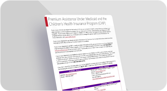 Premium Assistance Under Medicaid and the Children’s Health Insurance Program (CHIP) If you or your children are eligible for Medicaid or CHIP and you’re eligible for health coverage from your employer, your state may have a premium assistance program that can help pay for coverage, using funds from their Medicaid or CHIP programs. If you or your children aren’t eligible for Medicaid or CHIP, you won’t be eligible for these premium assistance programs but you may be able to buy individual insurance coverage through the Health Insurance Marketplace. For more information, visit www.healthcare.gov. If you or your dependents are already enrolled in Medicaid or CHIP and you live in a State listed below, contact your State Medicaid or CHIP office to find out if premium assistance is available. If you or your dependents are NOT currently enrolled in Medicaid or CHIP, and you think you or any of your dependents might be eligible for either of these programs, contact your State Medicaid or CHIP office or dial 1-877-KIDS NOW or www.insurekidsnow.gov to find out how to apply. If you qualify, ask your state if it has a program that might help you pay the premiums for an employer-sponsored plan. If you or your dependents are eligible for premium assistance under Medicaid or CHIP, as well as eligible under your employer plan, your employer must allow you to enroll in your employer plan if you aren’t already enrolled. This is called a “special enrollment” opportunity, and you must request coverage within 60 days of being determined eligible for premium assistance. If you have questions about enrolling in your employer plan, contact the Department of Labor at www.askebsa.dol.gov or call 1-866-444-EBSA (3272). If you live in one of the following states, you may be eligible for assistance paying your employer health plan premiums. The following list of states is current as of July 31, 2024. Contact your State for more information on eligibility – ALABAMA – Medicaid ALASKA – Medicaid Website: http://myalhipp.com/ The AK Health Insurance Premium Payment Program Phone: 1-855-692-5447 Website: http://myakhipp.com/ Phone: 1-866-251-4861 Email: CustomerService@MyAKHIPP.com Medicaid Eligibility: https://health.alaska.gov/dpa/Pages/default.aspx ARKANSAS – Medicaid CALIFORNIA – Medicaid Website: http://myarhipp.com/ Health Insurance Premium Payment (HIPP) Program Phone: 1-855-MyARHIPP (855-692-7447) Website: http://dhcs.ca.gov/hipp Phone: 916-445-8322 Fax: 916-440-5676 Email: hipp@dhcs.ca.gov COLORADO – Health First Colorado (Colorado’s FLORIDA – Medicaid Medicaid Program) & Child Health Plan Plus (CHP+) Website: Health First Colorado Website: https://www.flmedicaidtplrecovery.com/flmedicaidtplrecov https://www.healthfirstcolorado.com/ Health First Colorado Member Contact Center: ery.com/hipp/index.html 1-800-221-3943/State Relay 711 Phone: 1-877-357-3268 CHP+: hcpf.colorado.gov/child-health-plan-plus CHP+ Customer Service: 1-800-359-1991/State Relay 711 Health Insurance Buy-In Program (HIBI): https://www.mycohibi.com/ HIBI Customer Service: 1-855-692-6442 Page 9 Huntington County Community School Corporation 2025 Plan Year This Compliance Overview is not intended to be exhaustive nor should any discussion or opinions be construed as legal advice. Readers should contact legal counsel for legal advice.