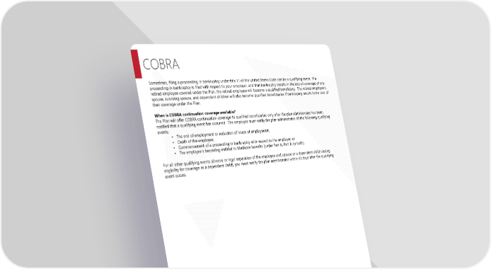 COBRA Sometimes, filing a proceeding in bankruptcy under title 11 of the United States Code can be a qualifying event. If a proceeding in bankruptcy is filed with respect to your employer, and that bankruptcy results in the loss of coverage of any retired employee covered under the Plan, the retired employee will become a qualified beneficiary. The retired employee’s spouse, surviving spouse, and dependent children will also become qualified beneficiaries if bankruptcy results in the loss of their coverage under the Plan. When is COBRA continuation coverage available? The Plan will offer COBRA continuation coverage to qualified beneficiaries only after the plan administrator has been notified that a qualifying event has occurred. The employer must notify the plan administrator of the following qualifying events: • The end of employment or reduction of hours of employment; • Death of the employee; • Commencement of a proceeding in bankruptcy with respect to the employer; or • The employee’s becoming entitled to Medicare benefits (under Part A, Part B, or both). For all other qualifying events (divorce or legal separation of the employee and spouse or a dependent child’s losing eligibility for coverage as a dependent child), you must notify the plan administrator within 60 days after the qualifying event occurs. Page 19 Huntington County Community School Corporation 2025 Plan Year This Compliance Overview is not intended to be exhaustive nor should any discussion or opinions be construed as legal advice. Readers should contact legal counsel for legal advice.