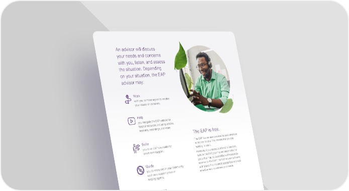 The EAP is free. The EAP is a service provided by your employer at no cost to you. That means that you pay nothing to use it. However, if you accept a referral to services outside the EAP, you may be responsible for costs that may be associated with resources external to the EAP. The EAP advisor will work with you to find the most appropriate and cost- effective help to address your needs. An advisor will discuss your needs and concerns with you, listen, and assess the situation. Depending on your situation, the EAP advisor may: Work with you to make a plan to resolve your issues or concerns. Help you navigate the EAP website for helpful resources, including articles, booklets, recordings, and more. Refer you to an EAP counselor for short-term support. Guide you to resources in your community, such as a support group or helping agency. Recommend community support for long-term counseling needs. If you are or someone close to you is going through a difficult time, remember the EAP is only a phone call away. Contact us today.