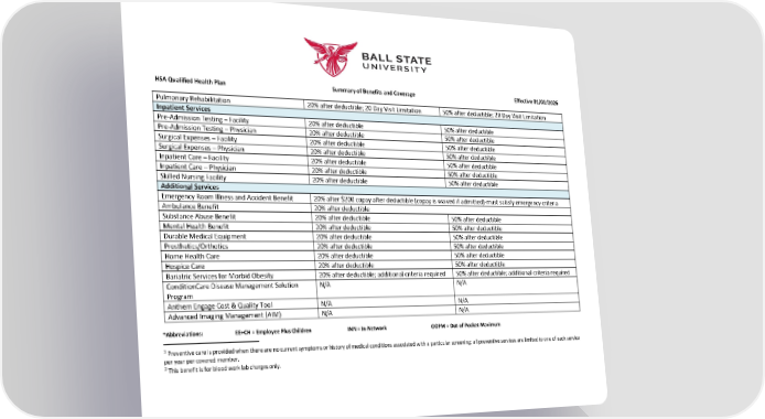 HSA Qualified Health Plan Summary of Benefits and Coverage Effective 01/01/2026 Pulmonary Rehabilitation 20% after deductible; 20 Day Visit Limitation 50% after deductible; 20 Day Visit Limitation Inpatient Services Pre-Admission Testing – Facility 20% after deductible 50% after deductible Pre-Admission Testing – Physician 20% after deductible 50% after deductible Surgical Expenses – Facility 20% after deductible 50% after deductible Surgical Expenses – Physician 20% after deductible 50% after deductible Inpatient Care – Facility 20% after deductible 50% after deductible Inpatient Care – Physician 20% after deductible 50% after deductible Skilled Nursing Facility 20% after deductible 50% after deductible Additional Services Emergency Room Illness and Accident Benefit 20% after $200 copay after deductible (copay is waived if admitted)-must satisfy emergency criteria Ambulance Benefit 20% after deductible Substance Abuse Benefit 20% after deductible 50% after deductible Mental Health Benefit 20% after deductible 50% after deductible Durable Medical Equipment 20% after deductible 50% after deductible Prosthetics/Orthotics 20% after deductible 50% after deductible Home Health Care 20% after deductible 50% after deductible Hospice Care 20% after deductible 50% after deductible Bariatric Services for Morbid Obesity 20% after deductible; additional criteria required 50% after deductible; additional criteria required ConditionCare Disease Management Solution Program N/A N/A Anthem Engage Cost & Quality Tool N/A N/A Advanced Imaging Management (AIM) N/A N/A *Abbreviations: EE+CH = Employee Plus Children INN = In-Network OOPM = Out-of-Pocket-Maximum 1 Preventive care is provided when there are no current symptoms or history of medical conditions associated with a particular screening; all preventive services are limited to one of each service per year per covered member. 2 This benefit is for blood work lab charges only.