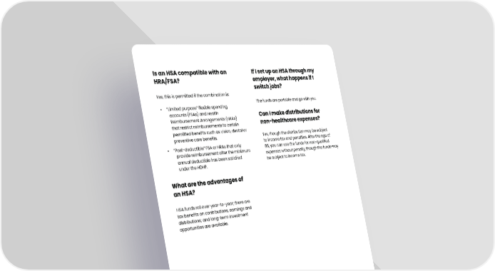 Is an HSA compatible with an HRA/FSA? Yes, this is permitted if the combination is: • “Limited purpose” flexible spending accounts (FSAs) and Health Reimbursement Arrangements (HRAs) that restrict reimbursements to certain permitted benefits such as vision, dental or preventive care benefits. • “Post-deductible” FSA or HRAs that only provide reimbursement after the minimum annual deductible has been satisfied under the HDHP. What are the advantages of an HSA? HSA funds roll over year-to-year; there are tax benefits on contributions, earnings and distributions; and long-term investment opportunities are available. If I set up an HSA through my employer, what happens if I switch jobs? The funds are portable and go with you. Can I make distributions for non-healthcare expenses? Yes, though the distribution may be subject to income tax and penalties. After the age of 65, you can use the funds for non-qualified expenses without penalty, though the funds may be subject to income tax. © 2023-2024 HSA Bank. HSA Bank is a division of Webster Bank, N.A., Member FDIC. Plan Administrative Services and Benefit Services are administered by Webster Servicing LLC. HSA_FAQ_090424 Visit hsabank.com or call the number on the back of your debit card for more information.