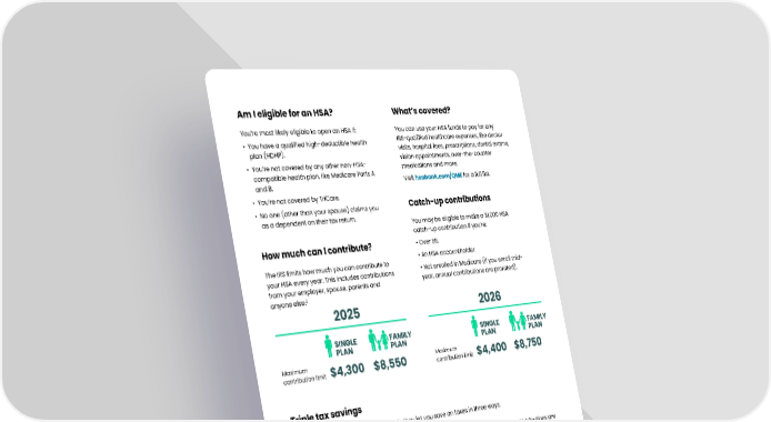 ¹ Investment accounts are not FDIC insured, may lose value and are not a deposit or other obligation of, or guarantee by the bank. Investment losses which are replaced are subject to the annual contribution limits of the HSA. 2 HSA contributions in excess of IRS limits are subject to penalty and tax unless the excess and earnings are withdrawn prior to the tax filing deadline as explained in IRS Publication 969. 3 Federal tax savings are available regardless of your state. State tax laws may vary. Consult a tax professional for more information. Triple tax savings A huge way that HSAs can benefit you is they let you save on taxes in three ways. You don’t pay federal taxes on contributions to your HSA.3 Earnings from interest and investments are tax-free. Distributions are tax-free when used for qualified healthcare expenses. How much can I contribute? The IRS limits how much you can contribute to your HSA every year. This includes contributions from your employer, spouse, parents and anyone else.2 Am I eligible for an HSA? You’re most likely eligible to open an HSA if: • You have a qualified high-deductible health plan (HDHP). • You’re not covered by any other non-HSA- compatible health plan, like Medicare Parts A and B. • You’re not covered by TriCare. • No one (other than your spouse) claims you as a dependent on their tax return. What’s covered? You can use your HSA funds to pay for any IRS-qualified healthcare expenses, like doctor visits, hospital fees, prescriptions, dental exams, vision appointments, over-the-counter medications and more. Visit hsabank.com/QME for a full list. ©2024-2025 HSA Bank. HSA Bank is a division of Webster Bank, N.A., Member FDIC. Plan Administrative Services and Benefit Services are administered by Webster Servicing LLC. HSA_Overview_2025/2026_Limits_051325 1 3 2 Catch-up contributions You may be eligible to make a $1,000 HSA catch-up contribution if you’re: • Over 55. • An HSA accountholder. • Not enrolled in Medicare (if you enroll mid- year, annual contributions are prorated). Visit hsabank.com or call the number on the back of your debit card for more information. 2025 Maximum contribution limit $4,300 SINGLE PLAN FAMILY PLAN $8,550 2026 Maximum contribution limit $4,400 SINGLE PLAN FAMILY PLAN $8,750