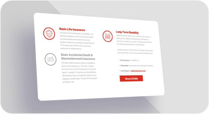 Basic Life Insurance The basic life insurance policy is available to all full-time employees. In the event of your death, your beneficiaries will receive a lump-sum payment based on your employee classification. HCCS pays all but $1.00 of the total annual premiums for these benefits. Basic Accidental Death & Dismemberment Insurance The basic AD&D insurance policy is available to all full-time employees. In the event of death, loss of (or loss of use of) a body part or function, speech, eyesight, or hearing, your beneficiaries will receive a lump-sum payment based on your employee classification. This benefit is bundled with Basic Life. Long-Term Disability Disability benefits protect your income during a period in which you are unable to work because of an illness or accident not related to your job. HCCS pays all but $1.00 of the total annual premiums for these benefits. Benefits begin on the 90 th day after the date of the incident and will cover 60% of your earnings (up to $5,000/month). Policy Number: 01-020575-00 Policyholder: Huntington County Community Schools Email Support: LADCLA@symetra.com File an LTD Claim