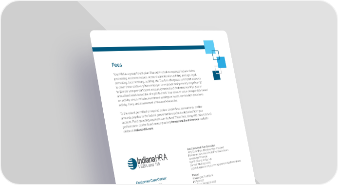 Fees Your HRA is a group health plan. Plan administrative expenses include claims processing, customer service, account administration, printing, postage, legal, consulting, local servicing, auditing, etc. The fees charged to participant accounts to cover these costs vary from employer to employer and generally range from $0 to $20 per year per participant account (prorated and deducted monthly), plus an annualized asset-based fee of 0.38% to 1.00%. Your account value changes daily based on activity, which includes investment earnings or losses, contribution and claims activity, if any, and assessment of the asset-based fee. To the extent permitted or required by law, certain fees, assessments, or other amounts payable to the federal government may also be deducted from your account. Fund operating expenses vary by fund. These fees, along with historical fund performance, can be found on our quarterly Investment Fund Overview available online at IndianaHRA.com. Local Service & Plan Education Amy Cummings, Divisional Vice President Retirement Services | VALIC Financial Advisors Corebridge Financial 630 W Carmel Dr Ste 140 Carmel, IN 46032-9562 (317) 818-5900 or amy.cummings@corebridge昀椀nancial.com Customer Care Center Trustee Washington Trust Bank 1-888-711-9182 PO Box 2127 www.IndianaHRA.com Spokane, WA 99210-2127 Plan Sponsor HRA Administrator, LLC 221 N Wall St Ste 201 Spokane, WA 99201 ® Plan Consultant Download our mobile app, HRAgo , today! Gallagher 221 N Wall St Ste 201 Spokane, WA 99201 Securities and investment advisory services offered through VALIC Financial Advisors, Inc. (“VFA”), member FINRA, SIPC and an SEC-registered investment advisor. VFA registered representatives offer securities and other products under retirement plans and IRAs, and to clients outside of such arrangements. VALIC, and VFA are members of American International Group, Inc. (“AIG”). American International Group, Inc. (AIG) is a leading global insurance organization. Founded in 1919, today AIG member companies provide a wide range of property casualty insurance, life insurance, retirement products and other 昀椀nancial services to customers in more than 80 countries and jurisdictions. pg. 7