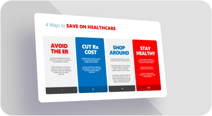 4 Ways to SAVE ON HEALTHCARE $ AVOID THE ER FOR TRUE EMERGENCIES DONT HESITATE TO CALL 911 OR GO TO THE EMERGENCY ROOM. WHEN POSSIBLE, UTILIZING A WALK-IN CLINIC OR URGENT CARE WILL SAVE YOU TIME AND MONEY FOR THE SAME SERVICES. $$ CUT Rx COST COMPARE DRUG PRICES & TALK TO YOUR DOCTOR ABOUT LOWER COST OPTIONS. UTILIZE COUPONS & SERVICES LIKE GOODRx, Rx HELP CENTERS, OR THE COSTPLUS DRUG COMPANY. $$$ SHOP AROUND UTILIZE THE SYDNEY APP TO FIND THE BEST CARE AT THE BEST PRICE. CHECK DISCOUNTS IN THE SYDNEY APP FOR MEDICAL TREATMENTS, DENTAL, VISION, HEARING, FITNESS, FAMILY, PETS, & MORE. LAB WORK & IMAGING SERVICES LIKE ULTRASOUNDS, X-RAYS, CT SCANS, BLOOD DRAWS, ETC. ARE COSTLY. RESEARCH PROVIDERS BEFORE YOU MAKE AN APPT. $$$$ STAY HEALTHY LIVE A HEALTHY LIFESTYLE THROUGH REGULAR MOVEMENT & HEALTHY EATING HABITS. REGULARLY VISIT YOUR PRIMARY CARE PHYSICIAN. SCHEDULE YOUR ANNUAL PHYSICAL & PREVENTIVE CARE APPOINTMENTS.