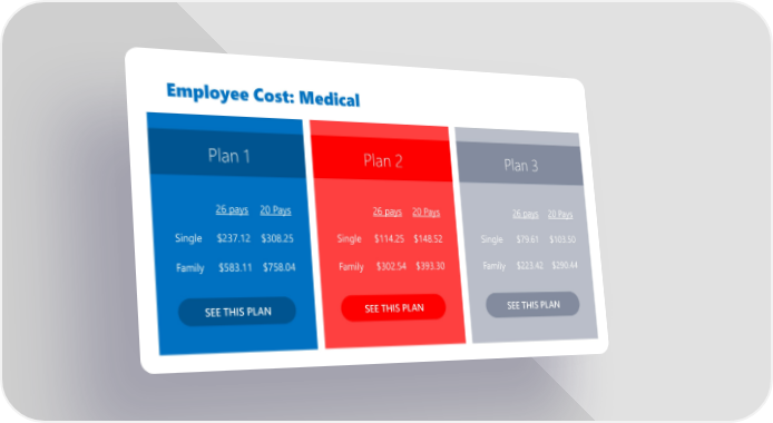Employee Cost: Medical Plan 2 SEE THIS PLAN Plan 1 SEE THIS PLAN Plan 3 SEE THIS PLAN 26 pays 20 Pays Single $237.12 $308.25 Family $583.11 $758.04 26 pays 20 Pays Single $114.25 $148.52 Family $302.54 $393.30 26 pays 20 Pays Single $79.61 $103.50 Family $223.42 $290.44