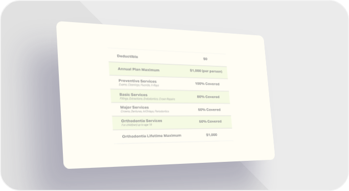 Deductible $0 Annual Plan Maximum $1,000 (per person) Preventive Services 100% Covered Exams, Cleanings, Fluoride, X-Rays Basic Services 80% Covered Fillings, Extractions, Endodontics, Crown Repairs Major Services 50% Covered Crowns, Dentures, In/Onlays, Periodontics Orthodontia Services 50% Covered For child(ren) up to age 19 Orthodontia Lifetime Maximum $1,000